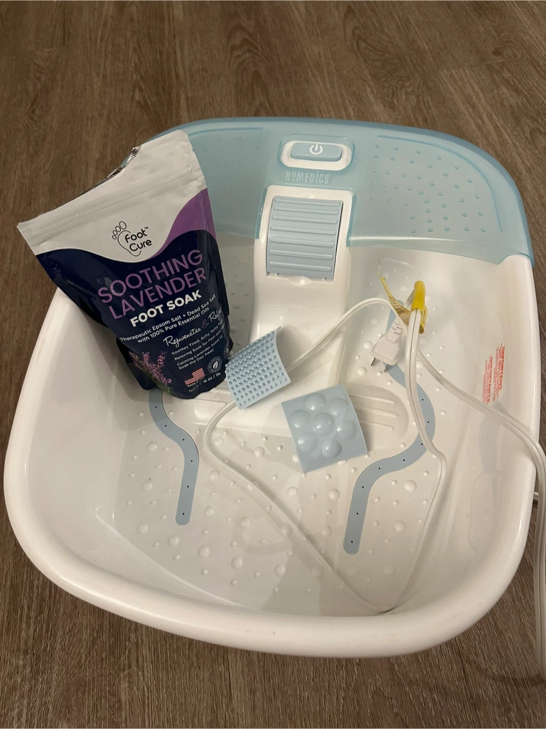 I'm selling a Homedics foot spa! It comes with a bag of Foot Cure Soothing Lavender Foot Salt Soak, which includes therapeutic Epsom salt and Dead Sea salt with 100% pure essential oils. It's perfect for rejuvenating and refreshing your feet after a long day