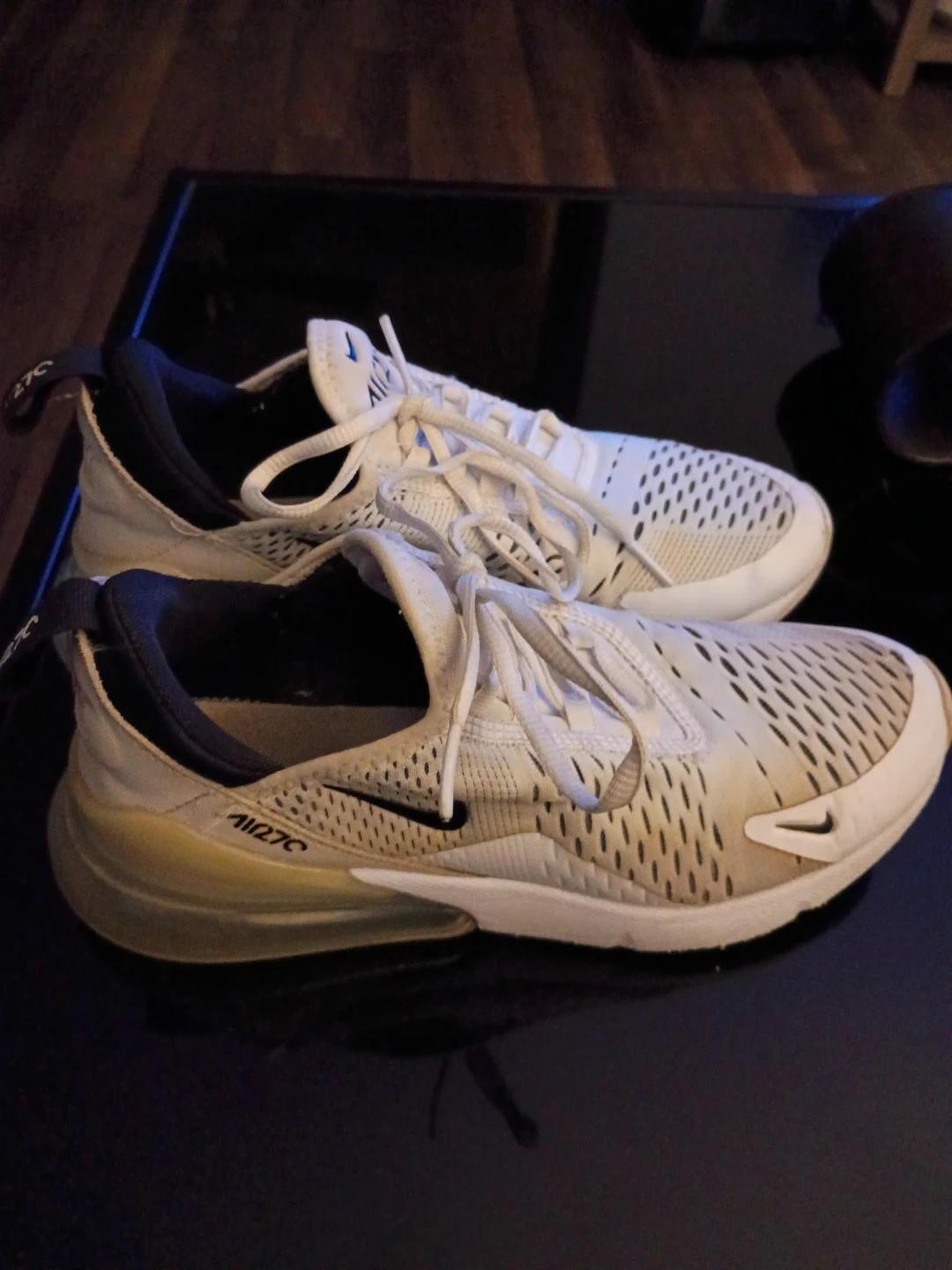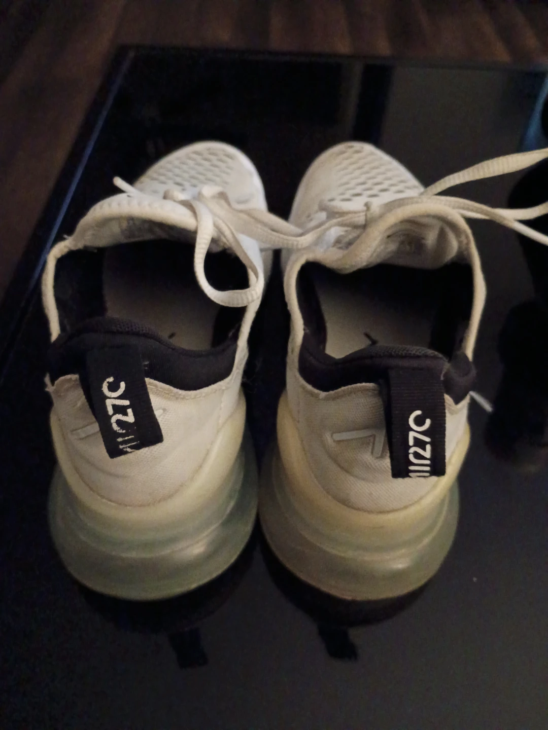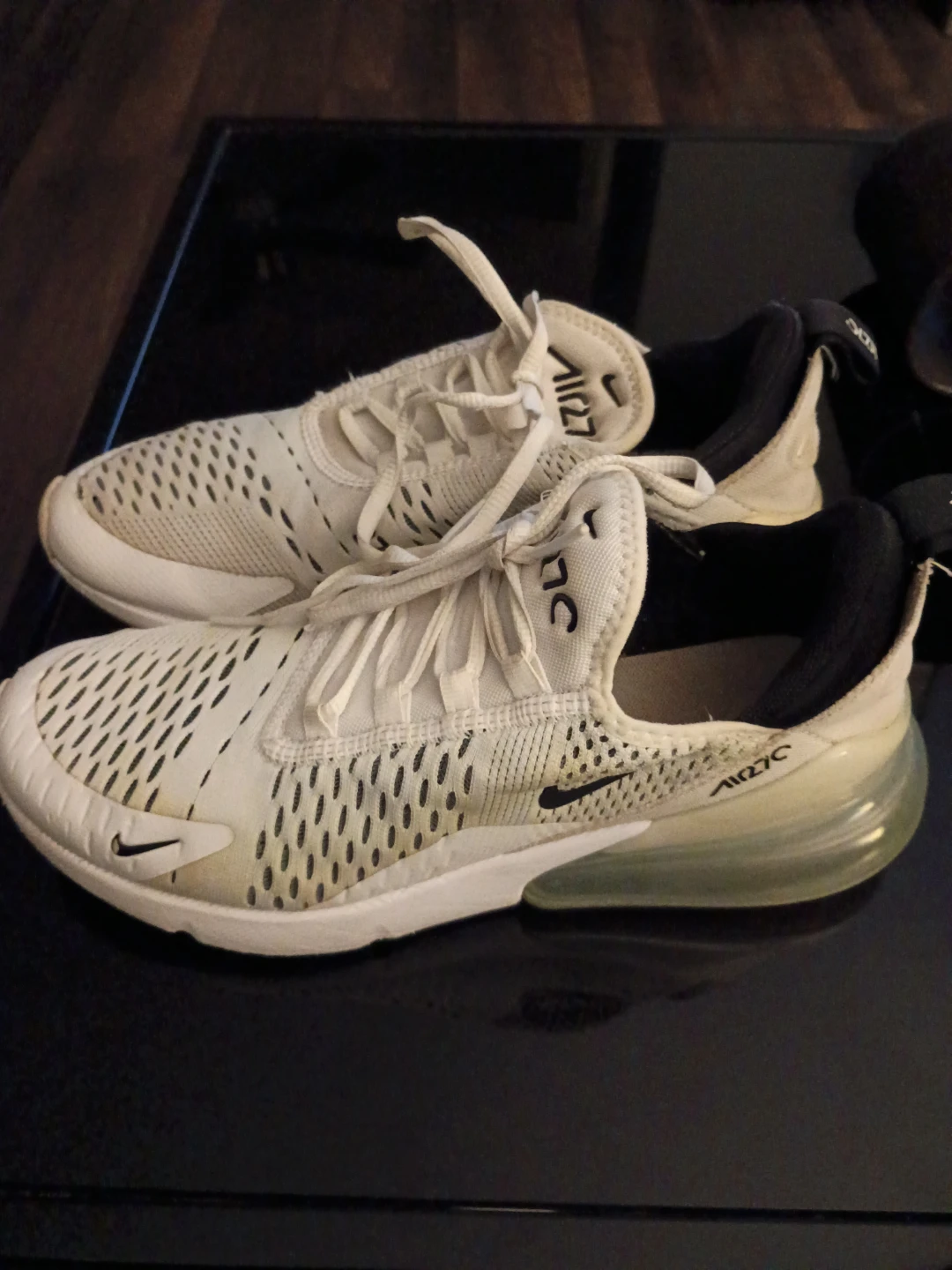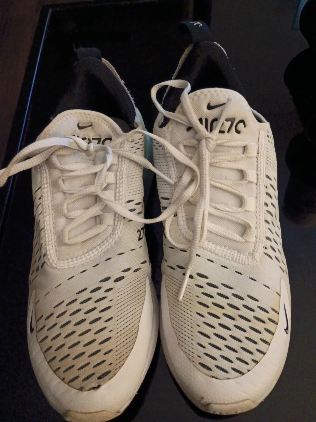 Selling a pair of Nike Air Max 270 sneakers in white. They have some signs of wear but are still in good condition and have lots of life left!