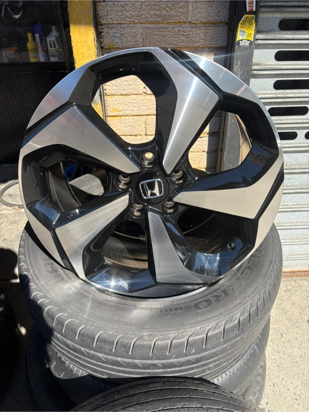 Selling a used Honda alloy wheel rim. It has a black and silver finish. Good condition!