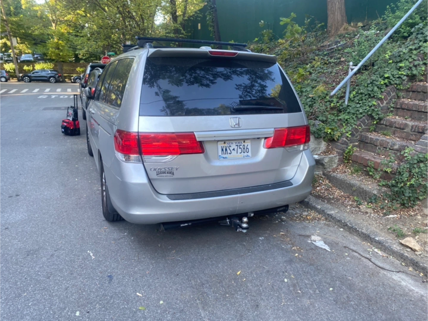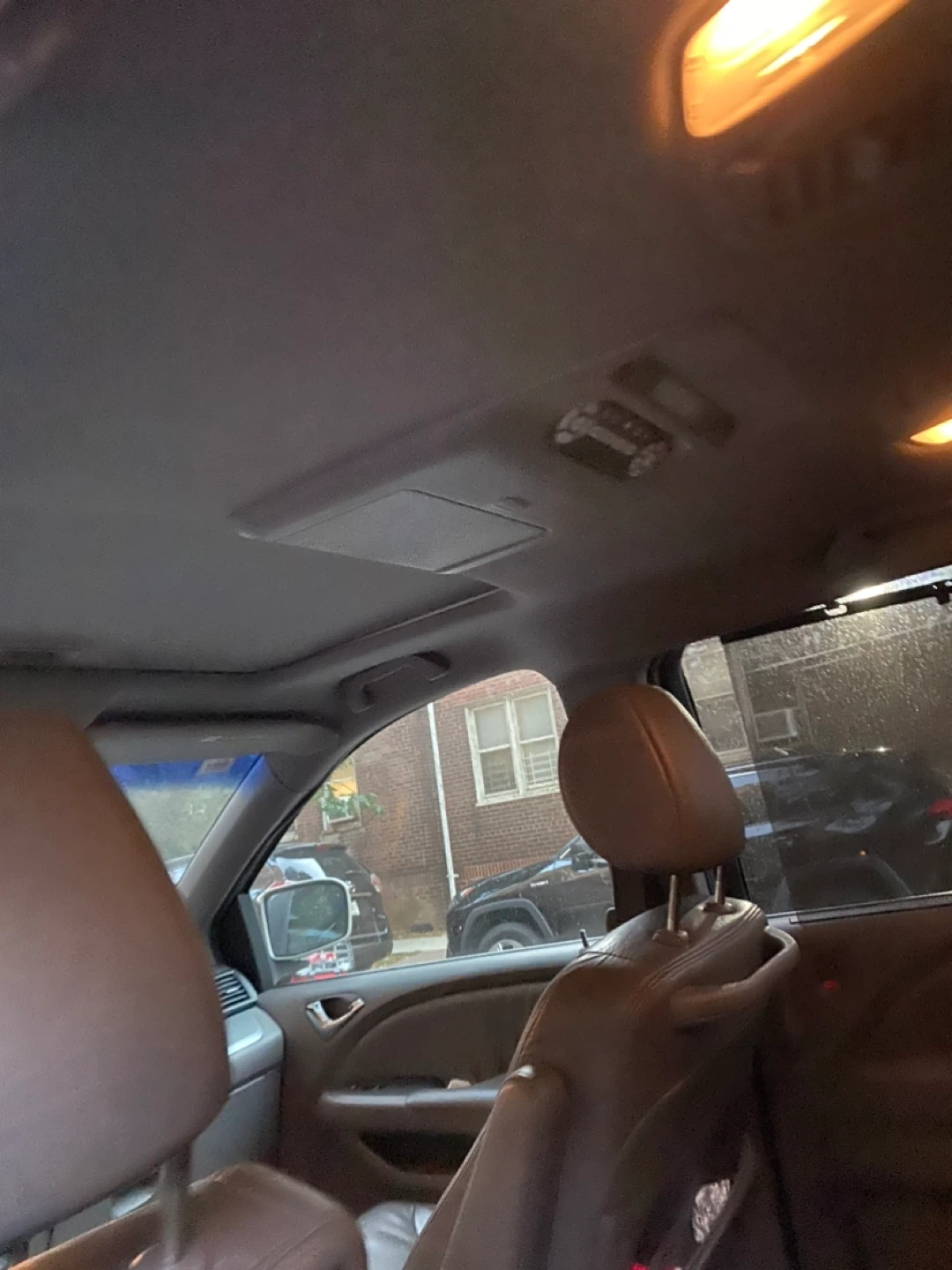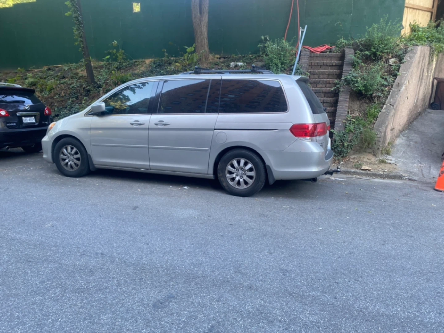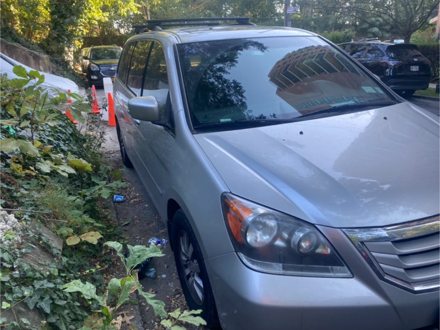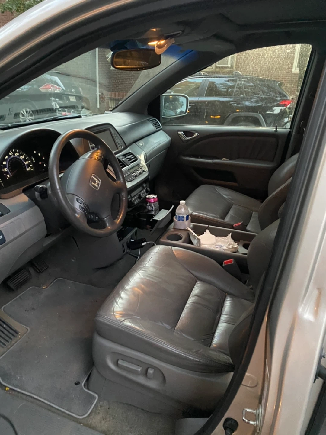 Selling a Honda Odyssey minivan. It's silver and has a sunroof. The interior is gray leather. It looks like it's in used condition.