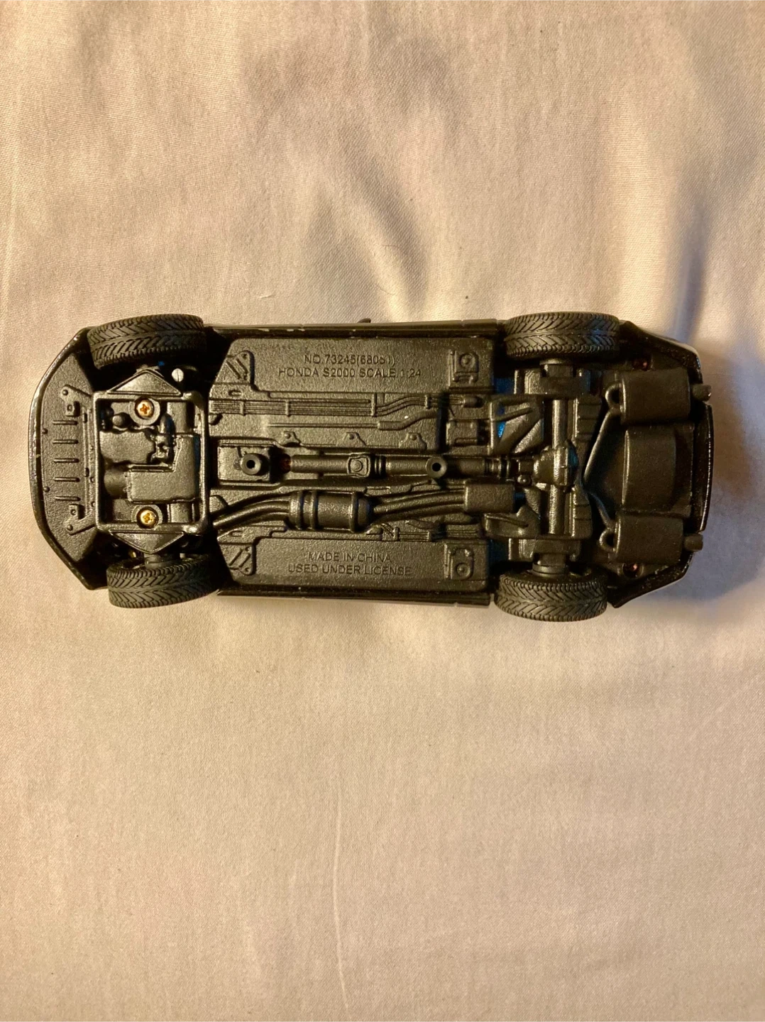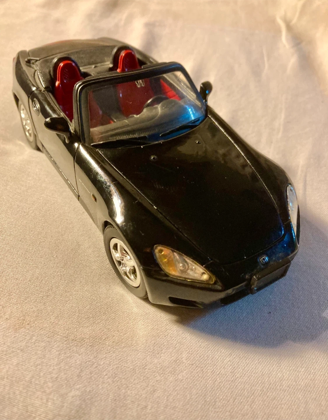 Selling a Honda S2000 scale model car. It's black with red interior. The scale is 1:24. It's in good condition with many parts of the car opening including turning front wheels with a steering