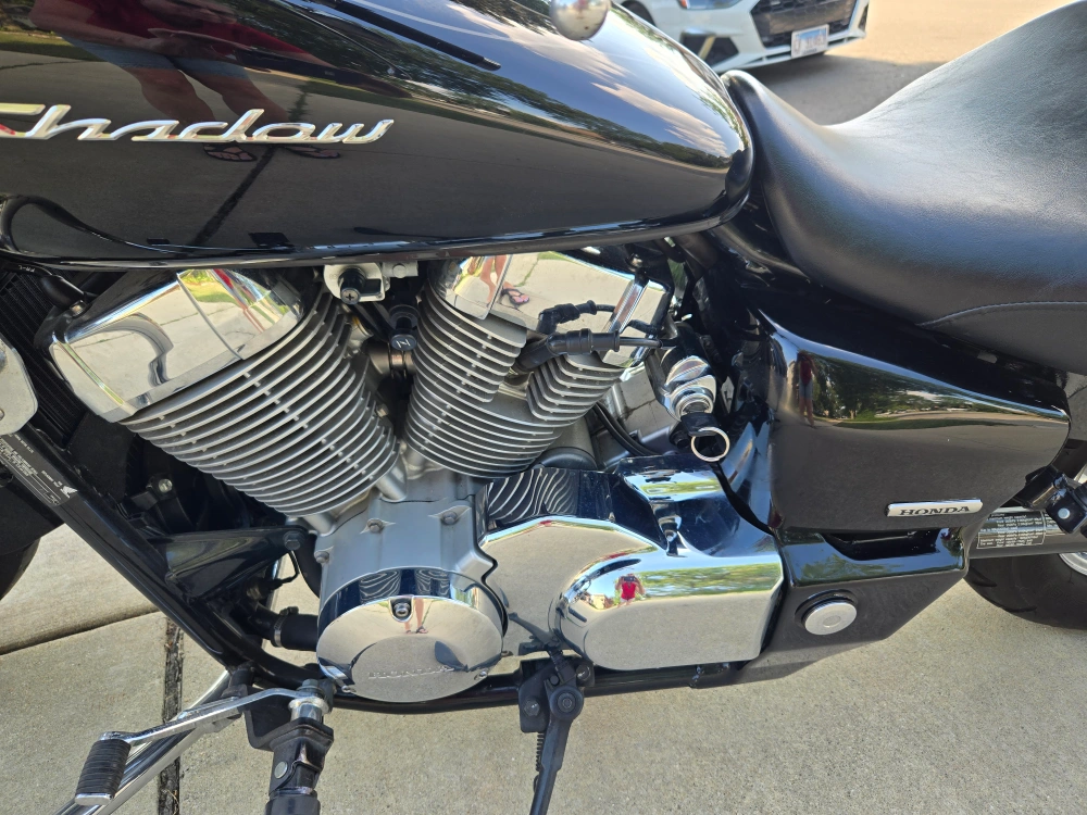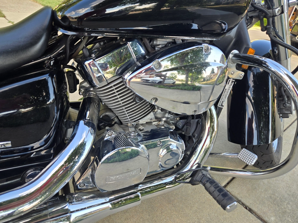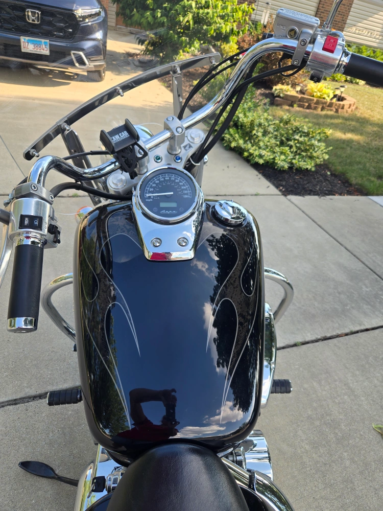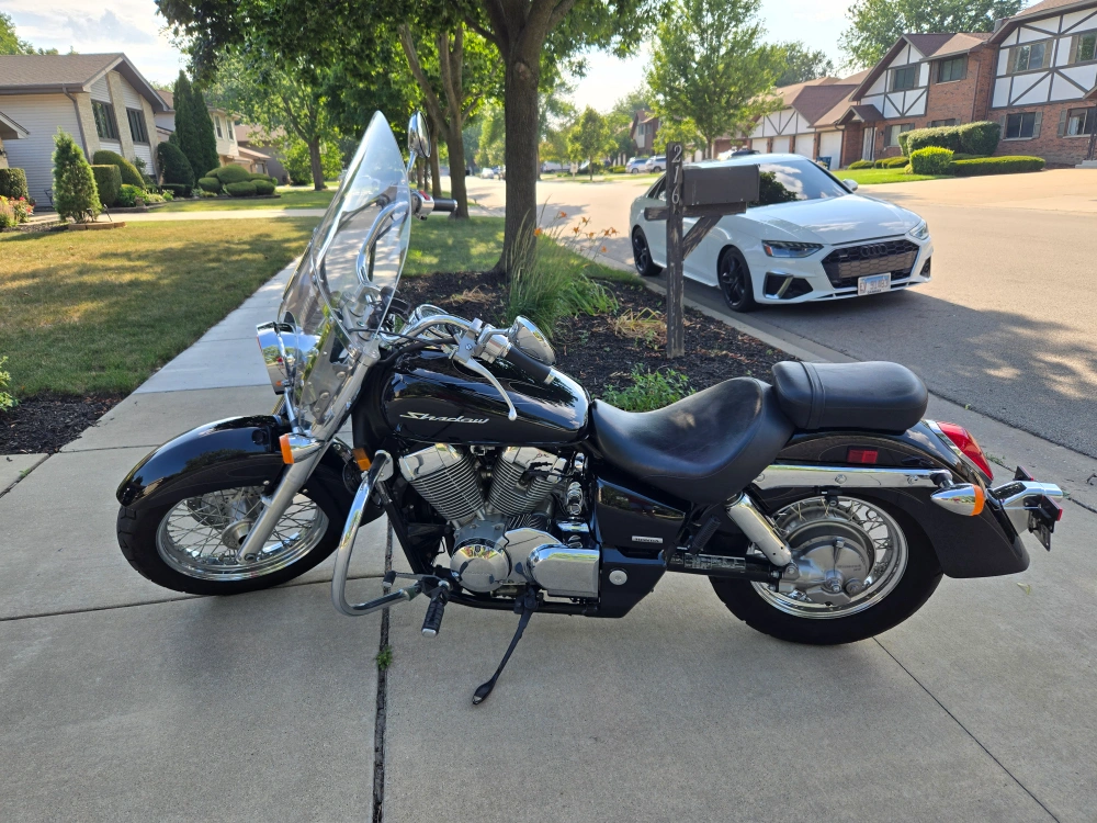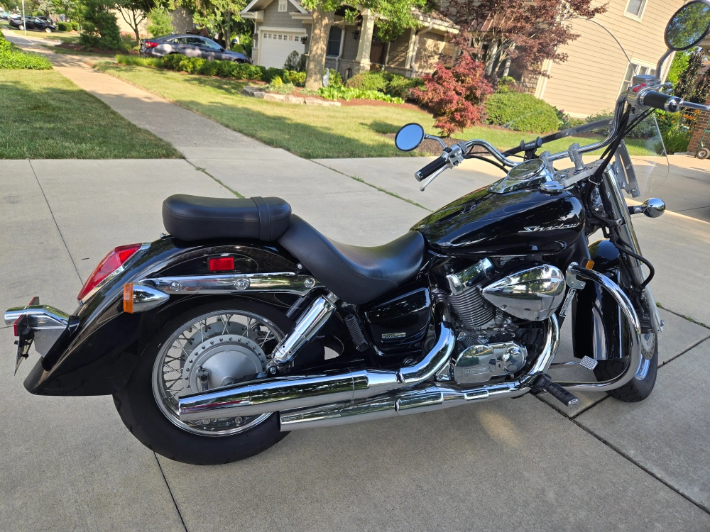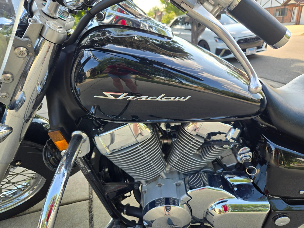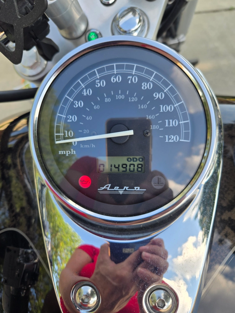 Selling a 2009 Honda Shadow Aero motorcycle. It's in good condition and ready to ride. The odometer reads 14908 miles. It has a sleek black finish with chrome accents. Feel free to message me with any questions!