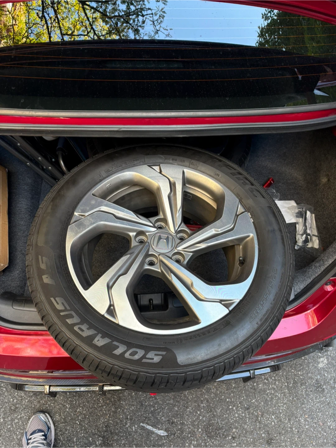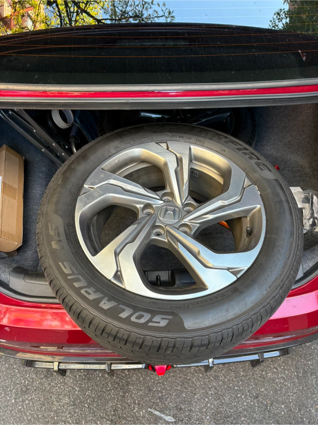 Selling a used Honda tire and rim. The tire is a Solarus, size 235/55R17. Nuevos con gomas casi nuevas y no estas pelados