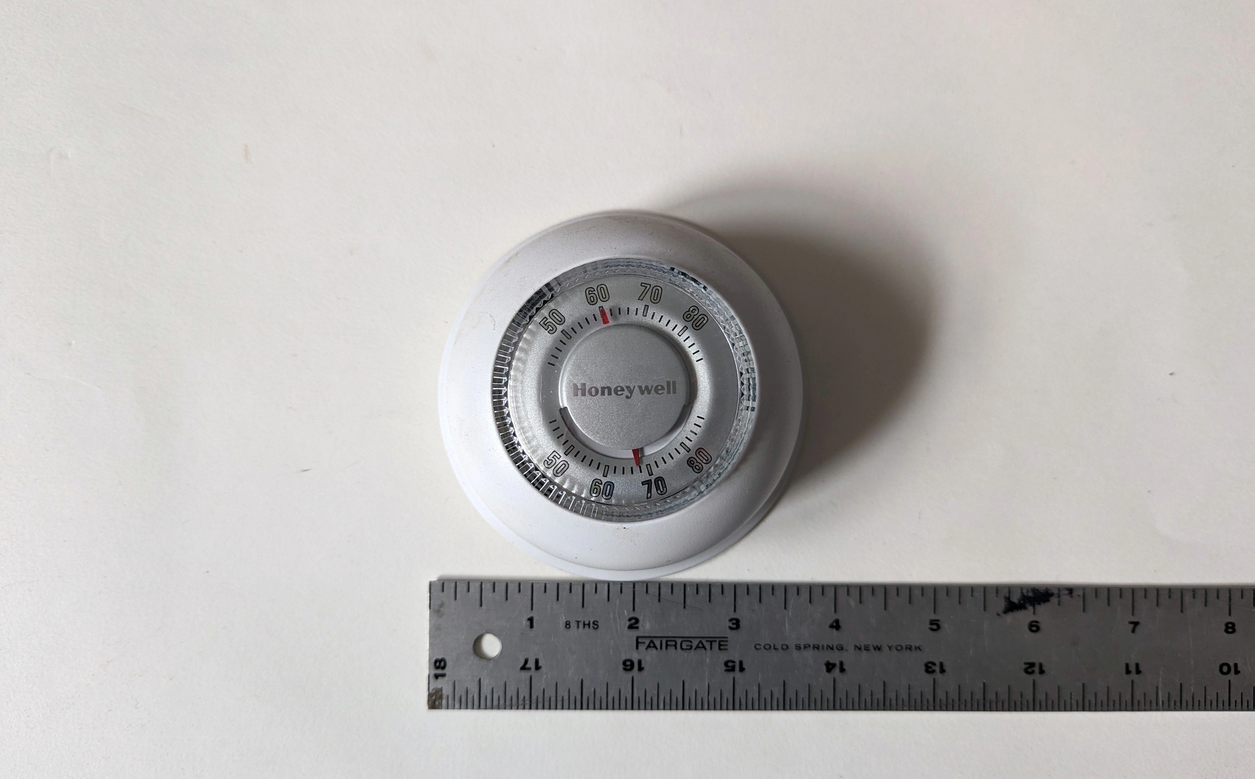 15This was used for our heating; we upgraded to a Nest and no longer need this. It's about 3" in diameter. And about 1.5" in thickness (from the wall). No mounting screws or anything, but they should be easy enough to acquire.