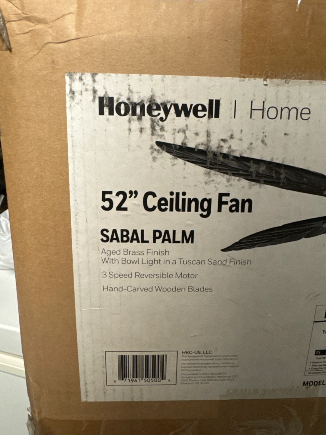 62Selling a Honeywell Home 52" ceiling fan, model Sabal Palm. It features an aged brass finish with a bowl light in a Tuscan sand finish. It also has a 3-speed reversible motor and hand-carved wooden blades.