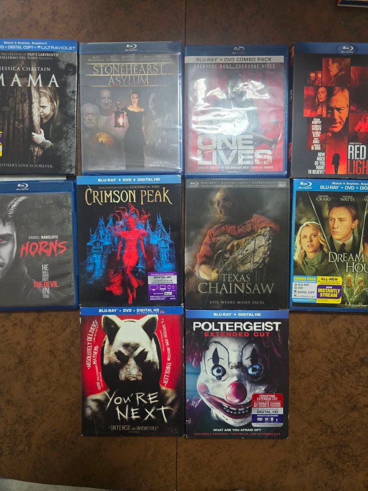 Selling a collection of horror movies on Blu-ray! Titles include Mama, Stonehearst Asylum(new), No One Lives, Horns, Crimson Peak(new), Texas Chainsaw, Dream House, You're Next, Red Lights, and Poltergeist. All are in great condition and ready for a spooky movie night
