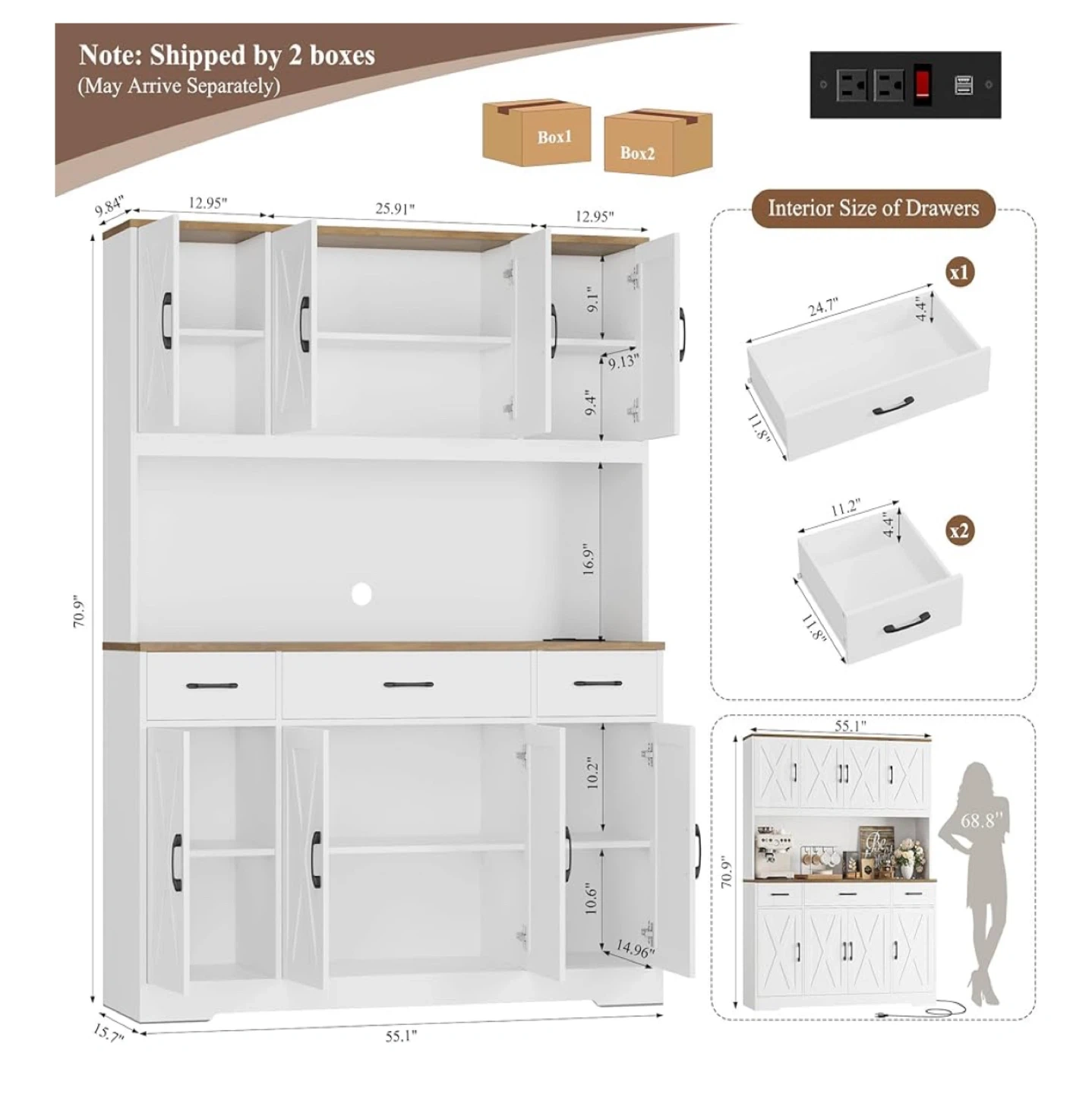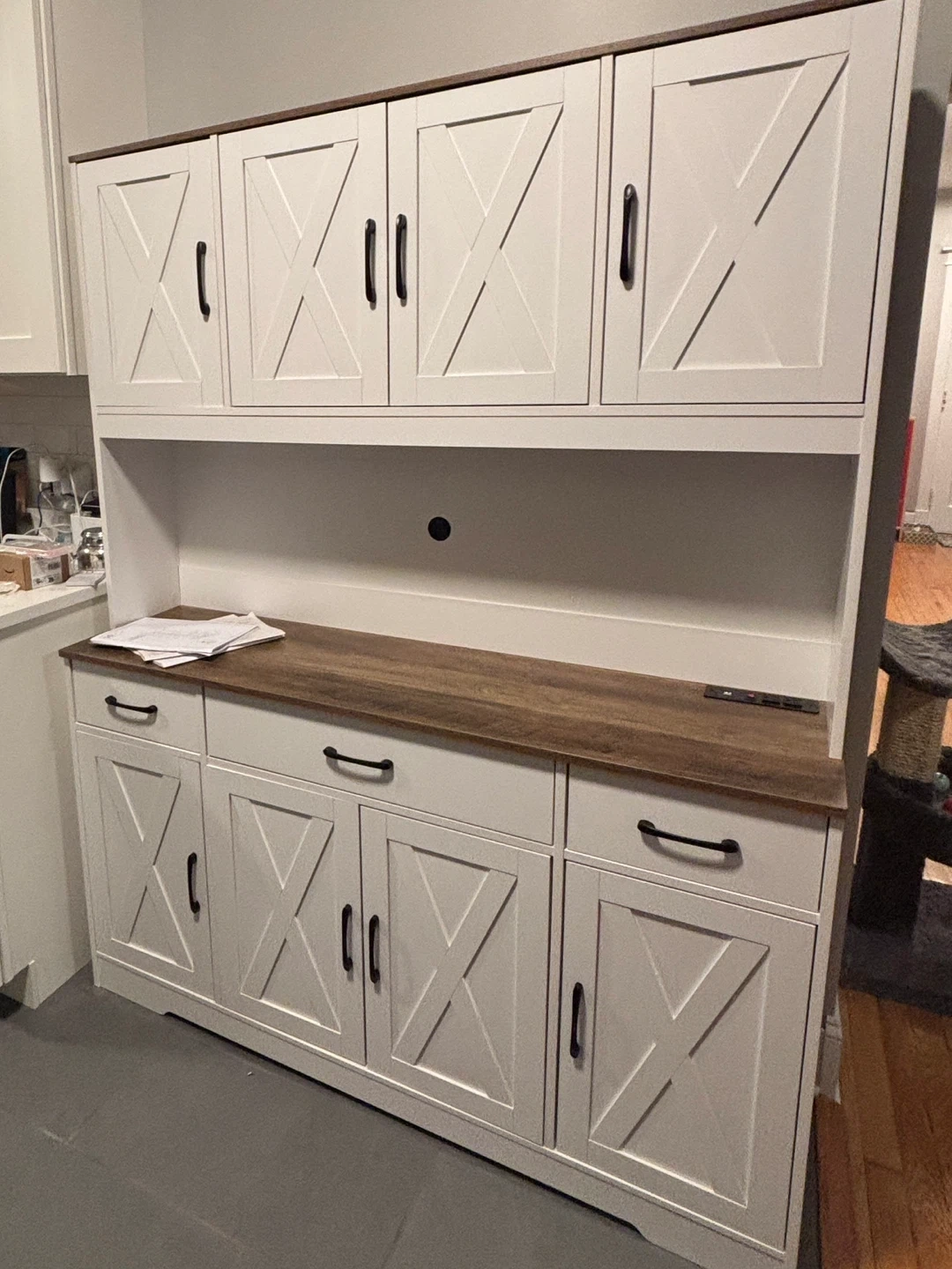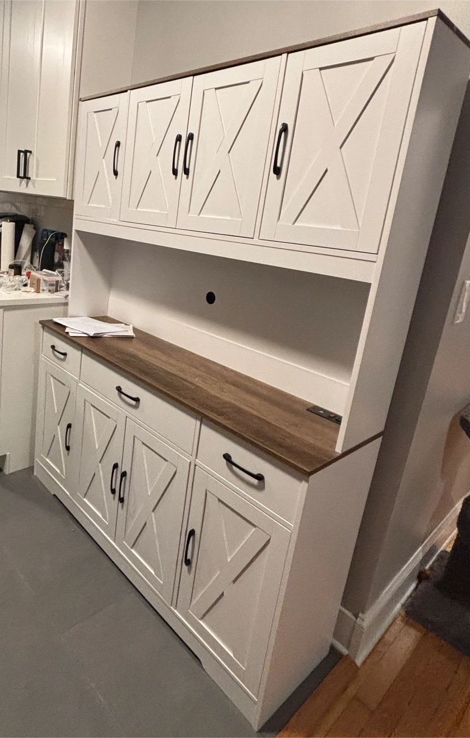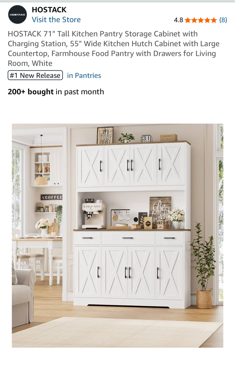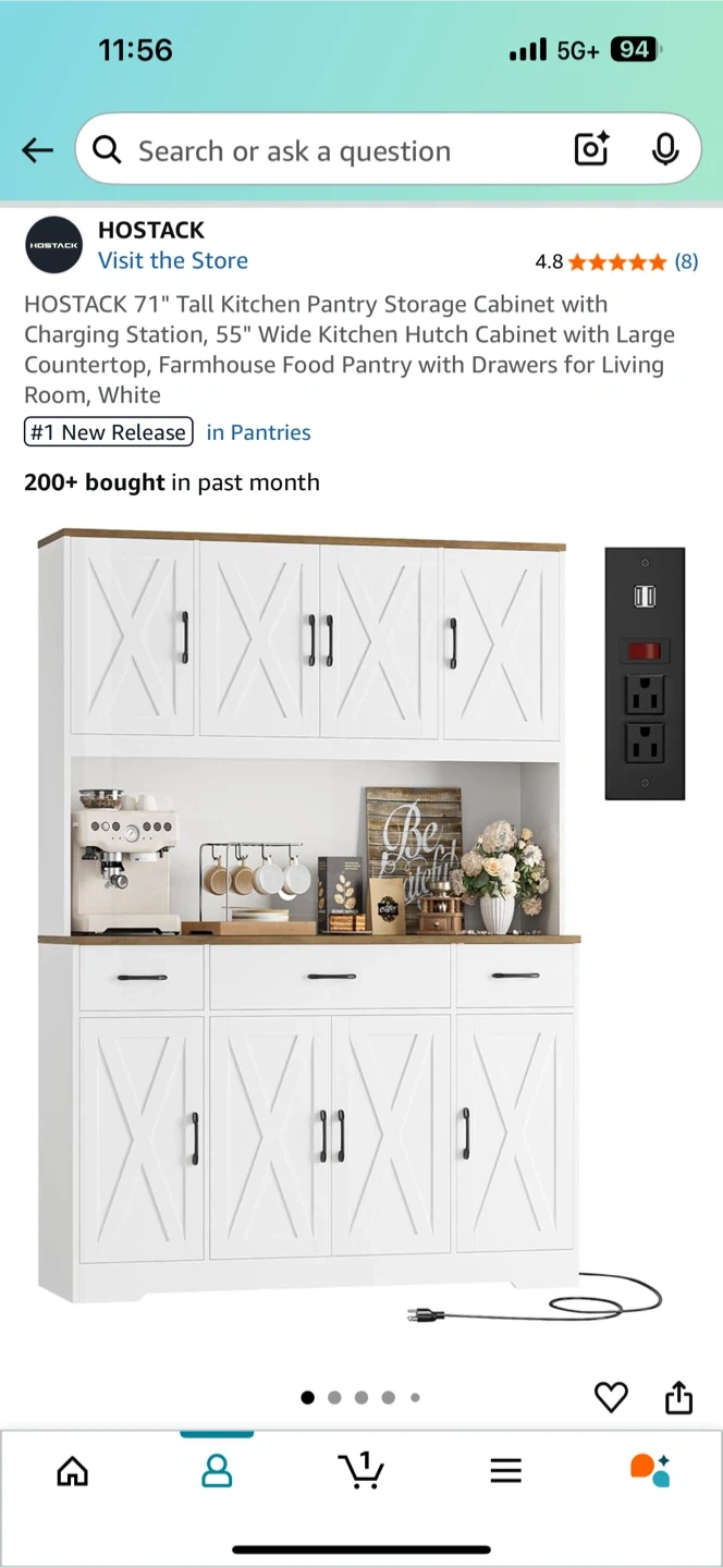 BRAND NEW! Already assembled! Original price $370 plus we paid for assembly. Selling for $350. Selling a HOSTACK 71" Tall Kitchen Pantry Storage Cabinet with CHARGING STATION. It has a 55" Wide Kitchen Hutch Cabinet with Large Countertop, and Farmhouse Food Pantry with Drawers for Living Room. The color is white. Great condition, just doesn’t fit in our space.