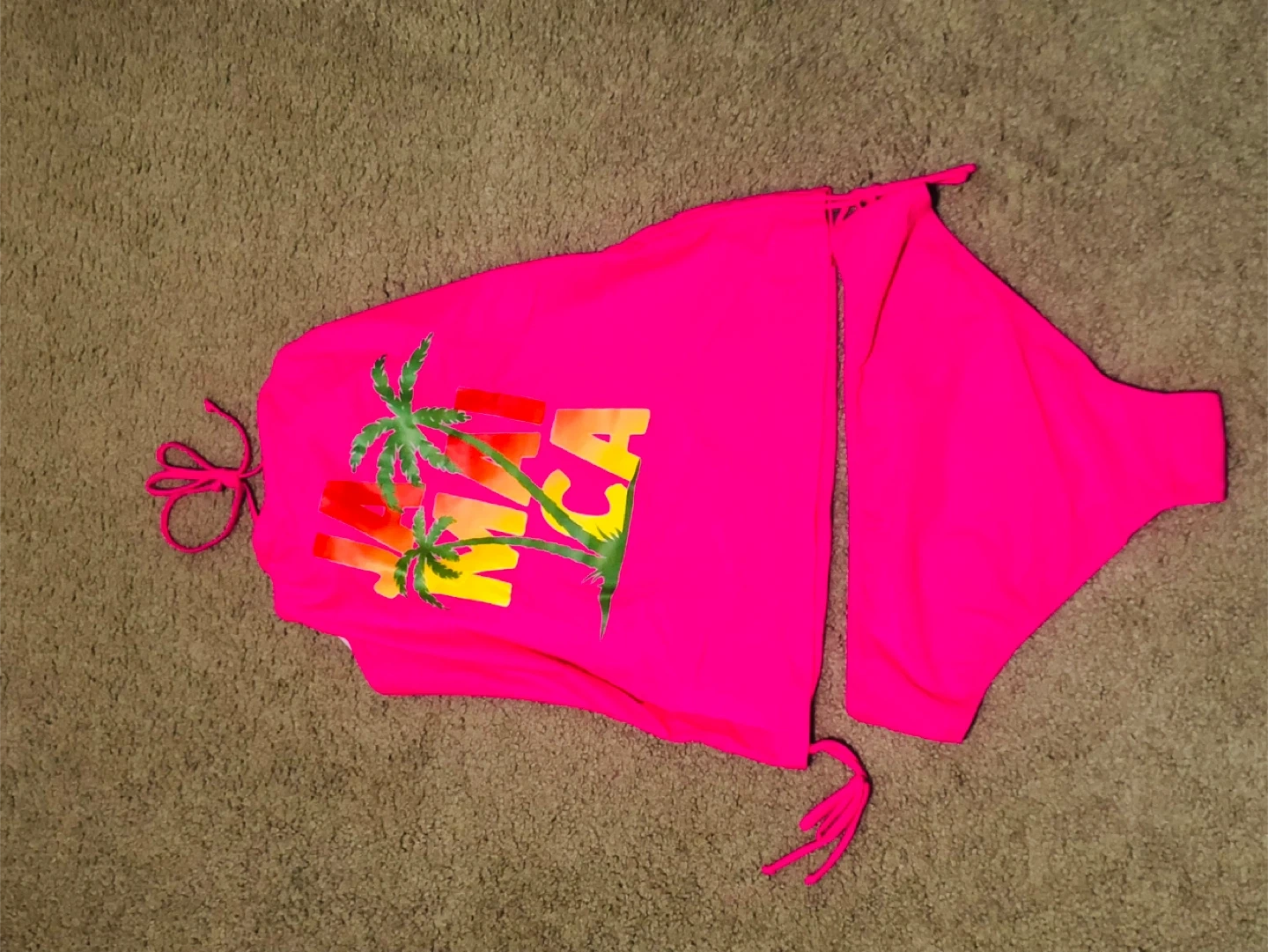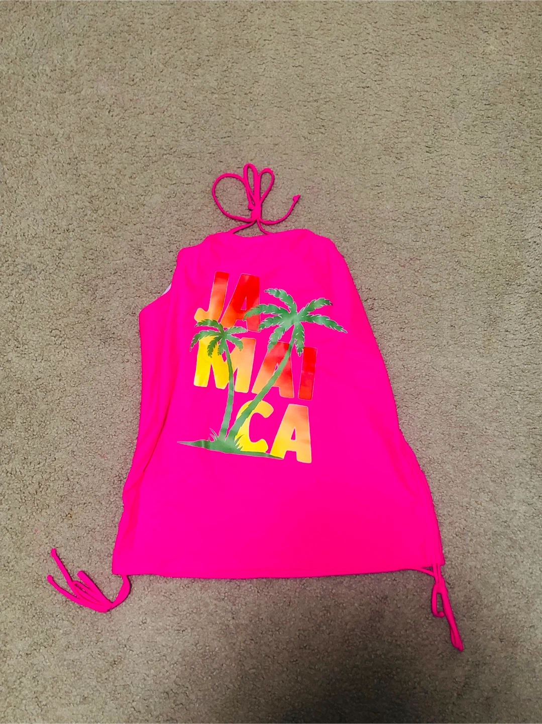 30Hot pink swimsuit coverup with a fun Jamaica design! It's an XL and made of a comfy blend of polyester and spandex