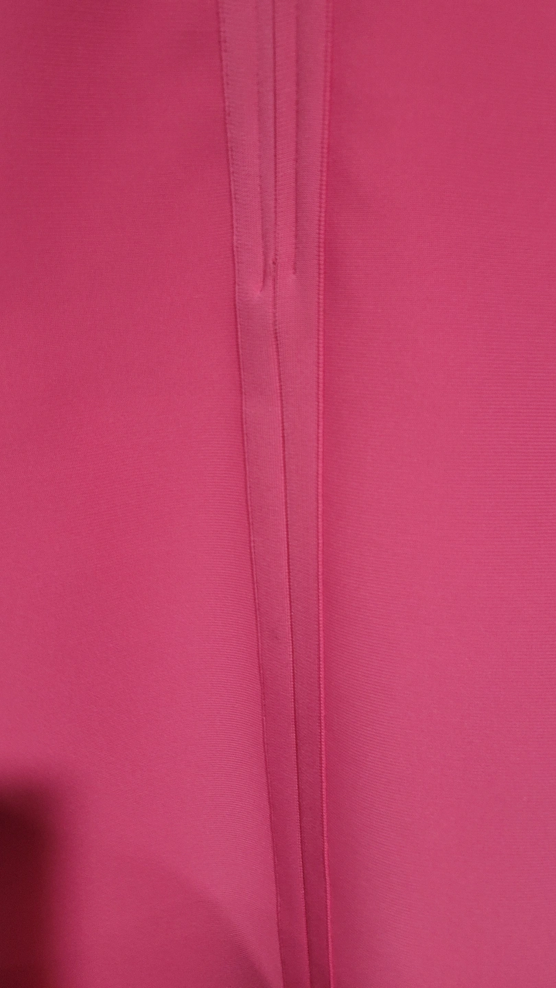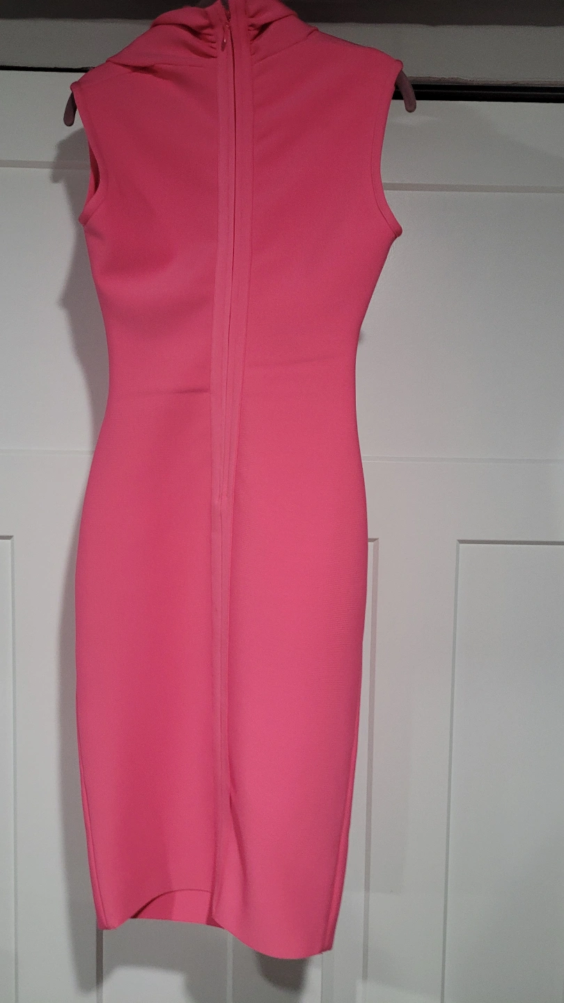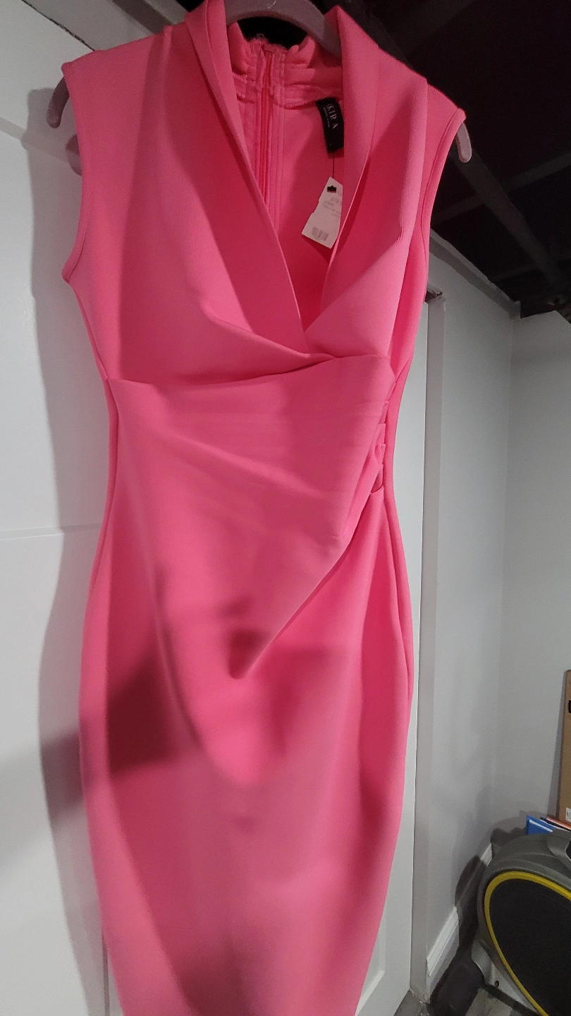 Form-fitting, sleeveless dress. Bright pink color. Features a V-neck and a concealed zipper in the back. Great for a night out or special occasion. Never worn