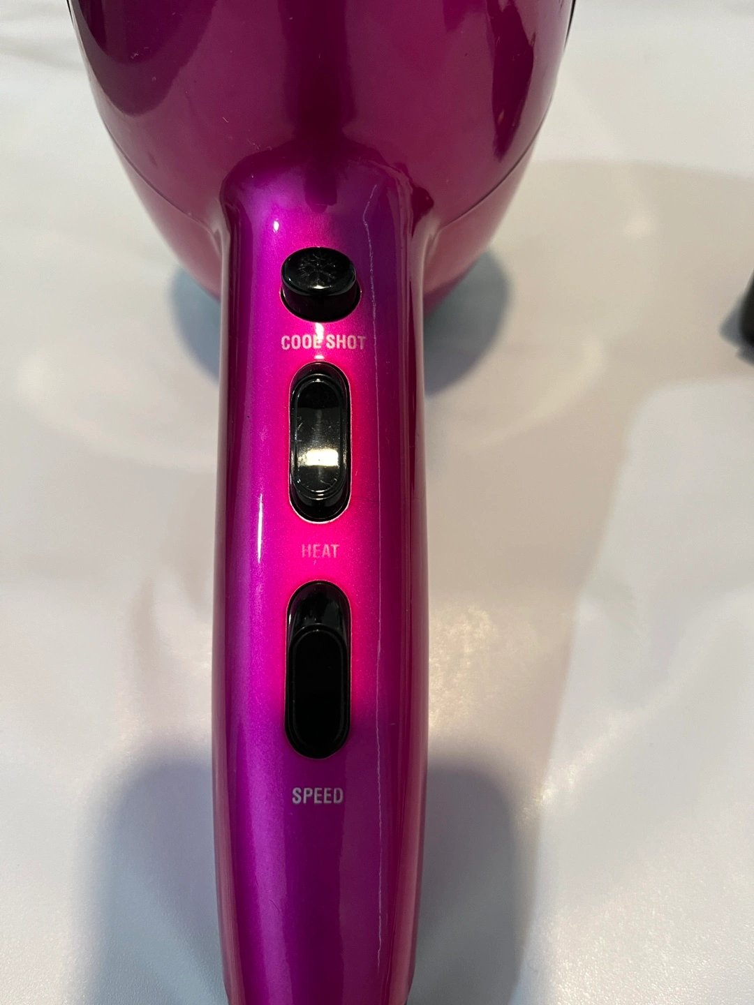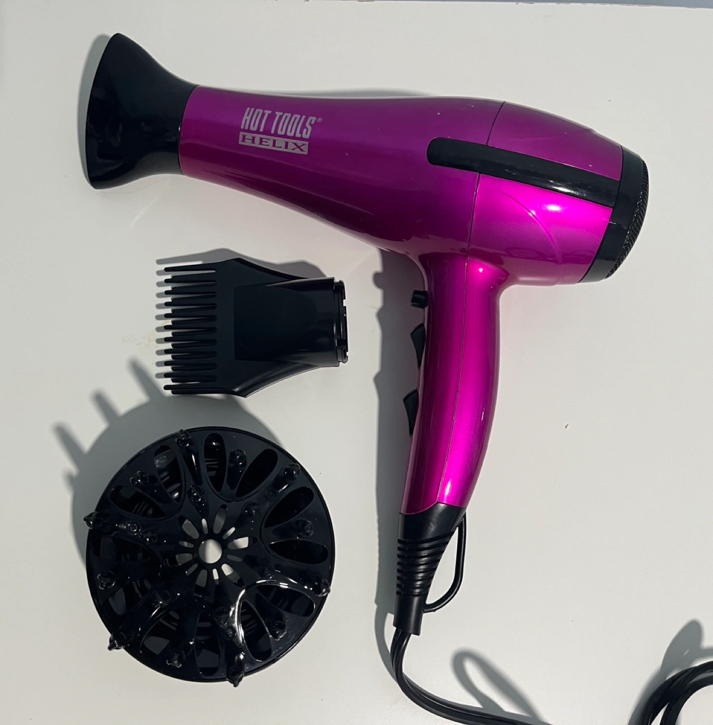 139Purple Hot Tools Helix hair dryer. Features multiple heat and speed settings, along with a cool shot button. Includes a power cord.