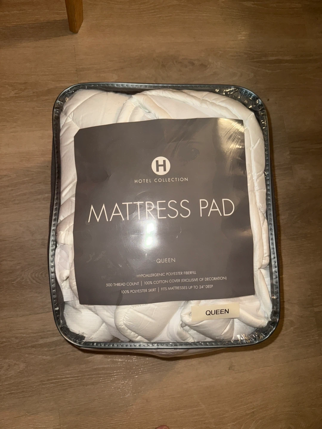 12Selling a brand new Hotel Collection mattress pad, still in its original packaging! It's a queen size and features: - Hypoallergenic polyester fiberfill - 500 thread count - 100% cotton cover (exclusive of decoration) - 100% polyester skirt - Fits mattresses up to 24" deep