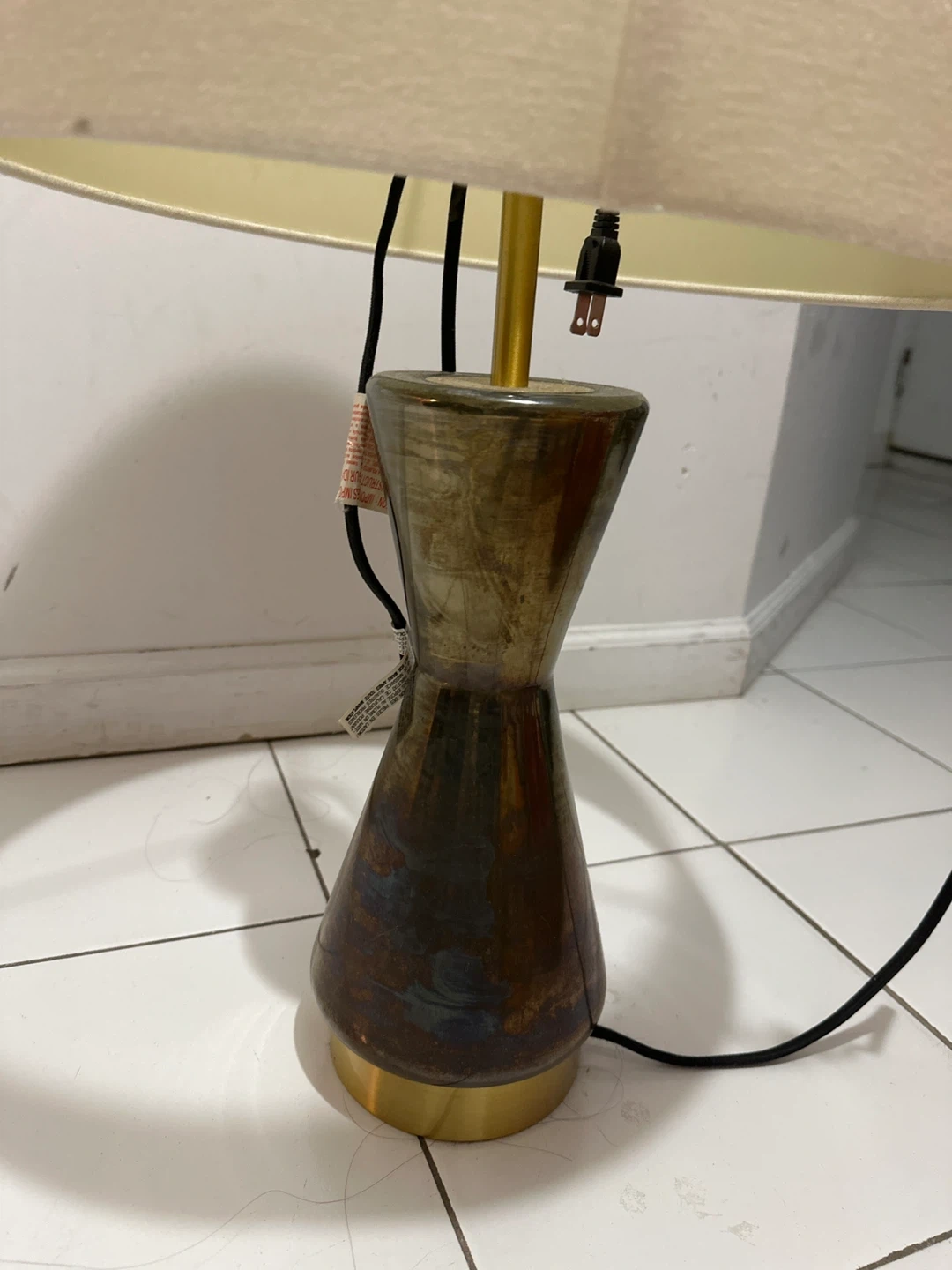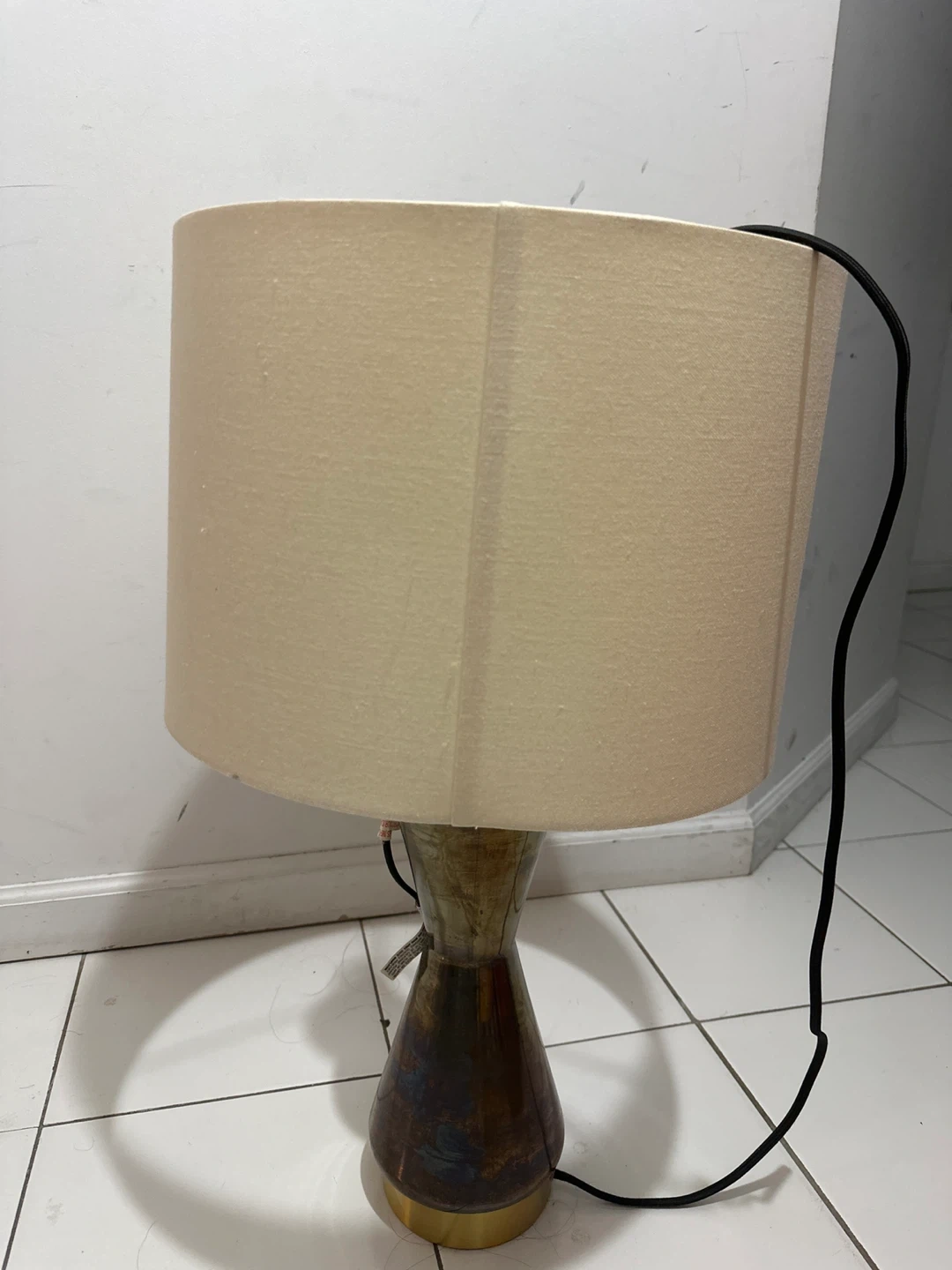 60Selling a stylish hourglass-shaped table lamp. It features a unique design with a beige lampshade and a dark brown/gold base. It would be a great addition to any room!