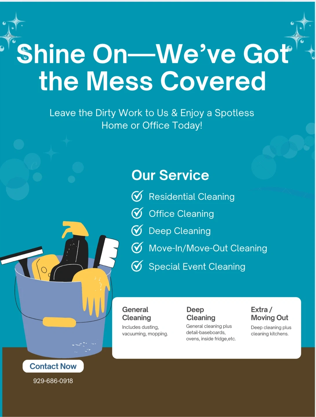 I do house cleaning and I offer three types of cleaning services. - General Cleaning - Deep Cleaning - Extra/ moving out services Travel fees are charged as well Prices can be discussed.