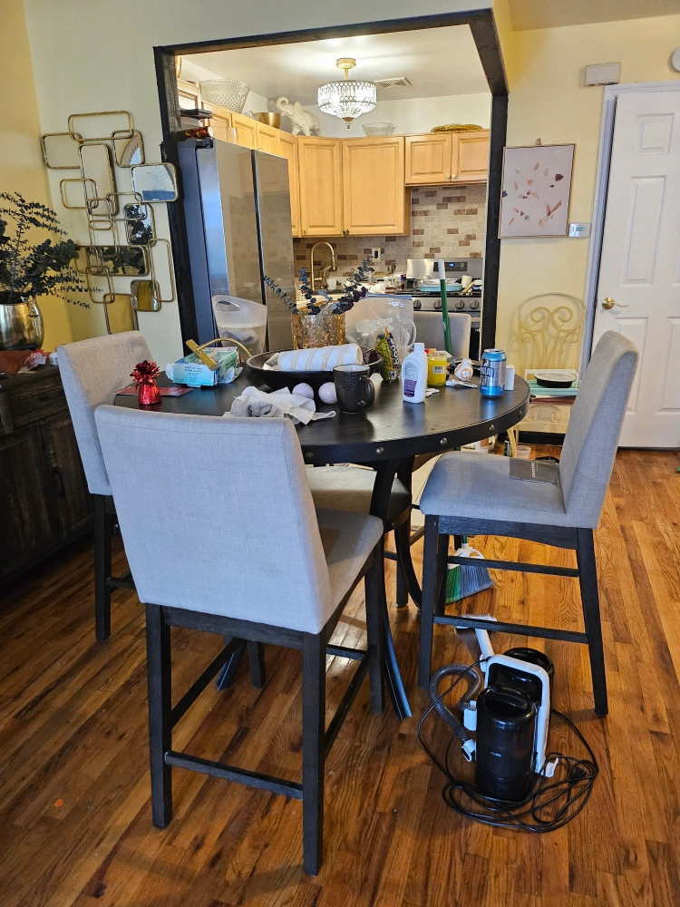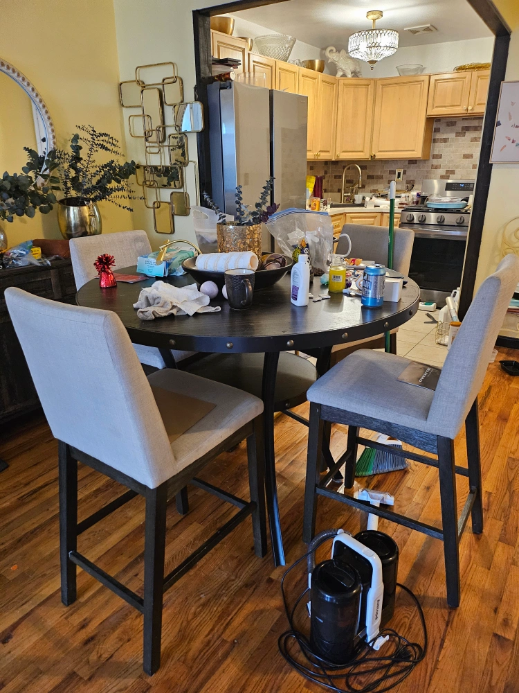 High chair dinning room set in good condition. table is round and v omes with four chairs. medical bed in very good condition for free. Just pick up the medical bed with new mattress. Game adult gaming game for 100 hundred dollars. white chair for 50 dollars in good condition.