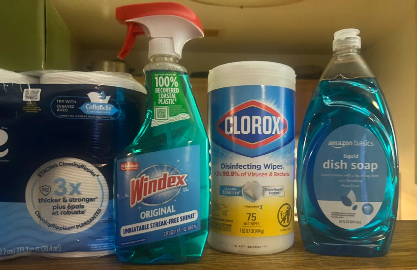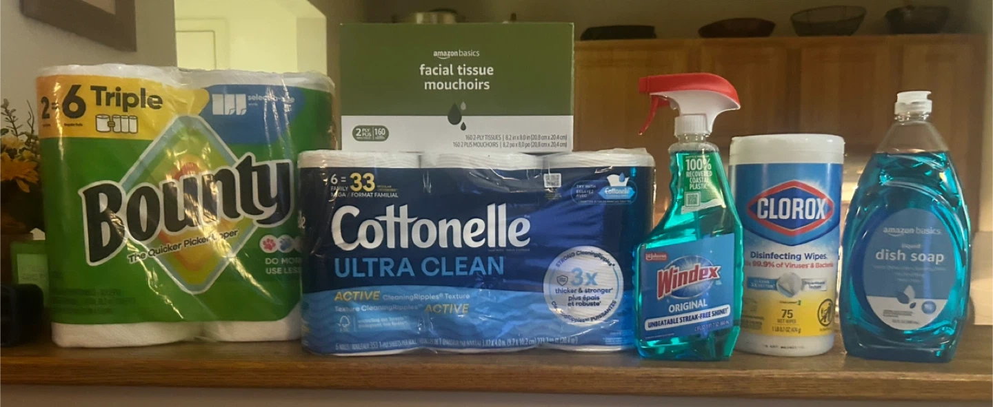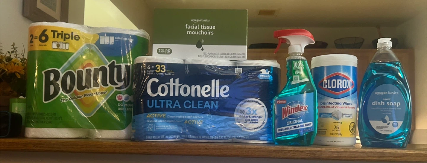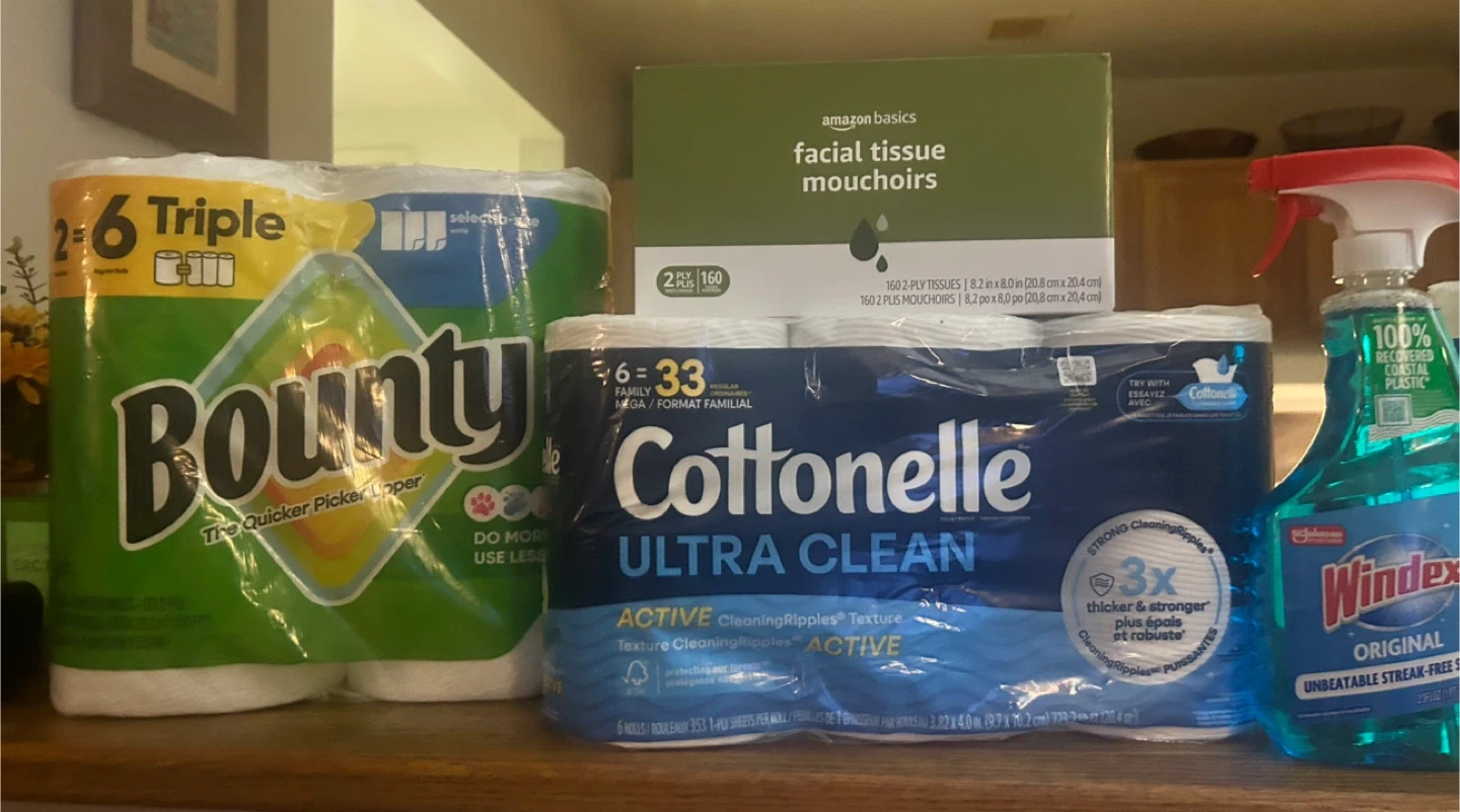 Selling a bundle of household essentials! You'll get Bounty paper towels (2 Big Rolls 123 2-Ply Sheers per roll) Cottonelle Ultra Clean toilet paper (6 Mega Rolls) Windex glass cleaner (23oz), Amazon Basics facial tissues (160 2-Ply Tissues) Clorox disinfecting wipes (75 Wipes) and Amazon Basics dish soap (30oz). Perfect for stocking up on cleaning supplies! All brand new!