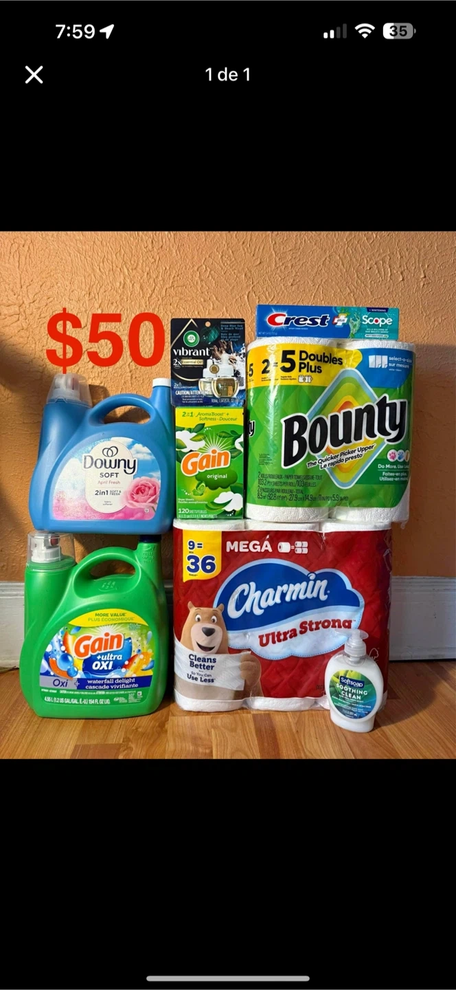 Selling a bundle of household cleaning supplies! Includes: - Downy April Fresh 2in1 - Gain Original - Gain +Ultra Oxi Waterfall Delight - Bounty Paper Towels - Charmin Ultra Strong Mega Rolls (9=36) - Softsoap Soothing Clean - Air Wick Vibrant
