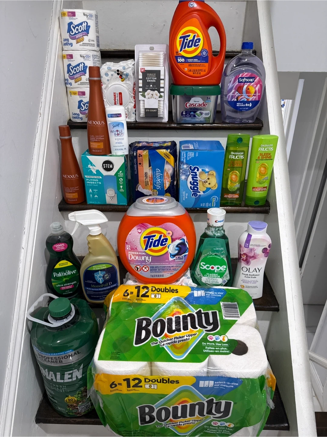 Selling a variety of household essentials! Includes brands like Tide, Bounty, Palmolive, and more. Great for stocking up on cleaning supplies and paper products.