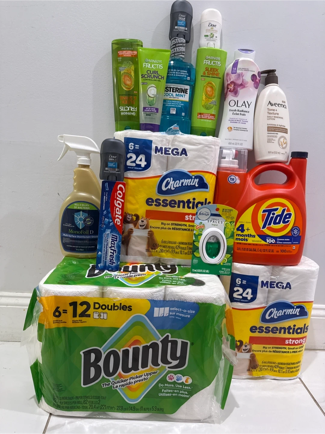Selling a bundle of household cleaning and personal care items. Includes brands like Bounty, Charmin, Tide, Dove, Garnier Fructis, Olay, and Aveeno! Great for stocking up on essentials