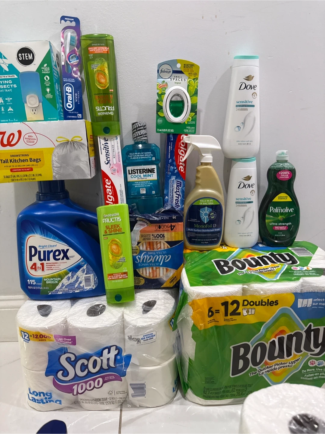 A collection of household cleaning and personal care items. Includes brands like Purex, Garnier Fructis, Oral-B, Colgate, Dove, Palmolive, Scott, and Bounty. Great for stocking up on essentials!