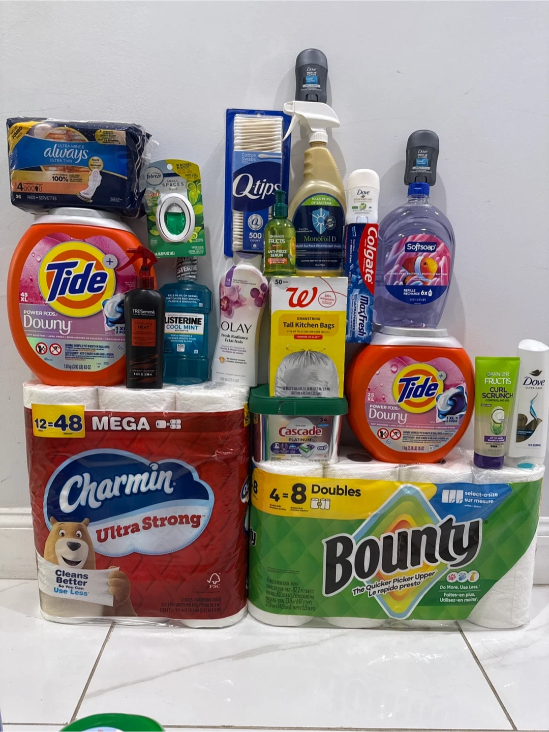I have a variety of household cleaning and personal care items available. This includes items like Tide Power Pods with Downy, Charmin Ultra Strong toilet paper, Bounty paper towels, Q-tips cotton swabs, Olay Fresh Radiance, and more! Great for stocking up on essentials