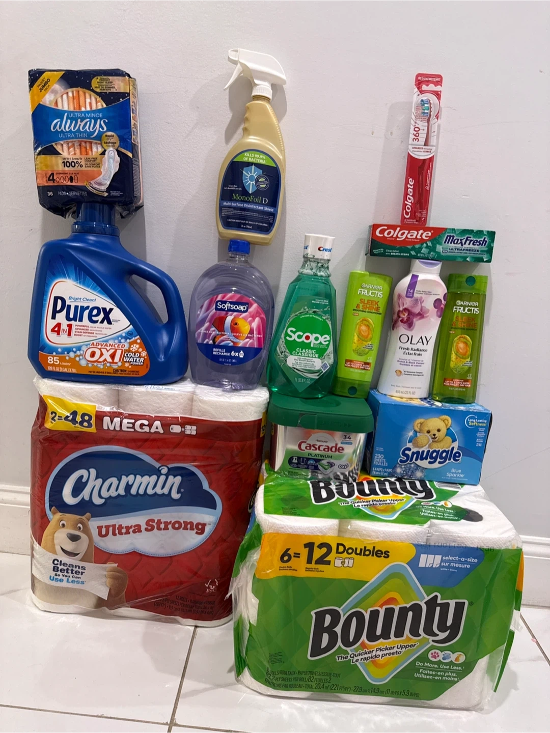 A handy bundle of household cleaning and personal care items! Includes Always Ultra Thin pads, Purex 4-in-1 detergent, Softsoap hand soap refills, Scope mouthwash, Garnier Fructis shampoo, Olay body wash, Charmin Ultra Strong toilet paper, Cascade Platinum dishwashing pacs, Snuggle Blue Sparkle fabric softener sheets, and Bounty paper towels
