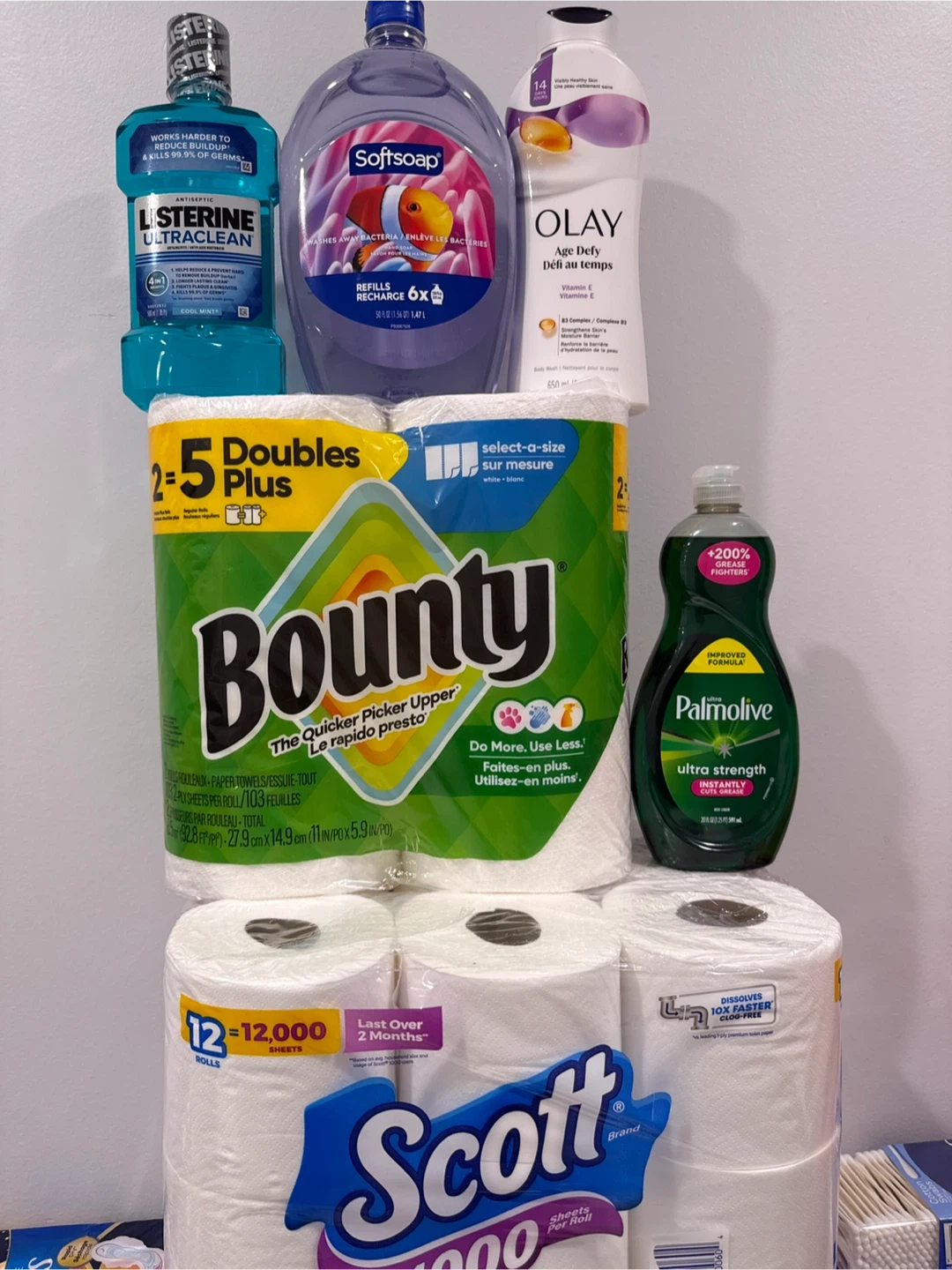 48Selling a household cleaning bundle that includes: - Listerine Ultraclean - Softsoap refills 6x - Olay Age Defy - Bounty paper towels - Palmolive ultra strength - Scott 1000 sheets per roll