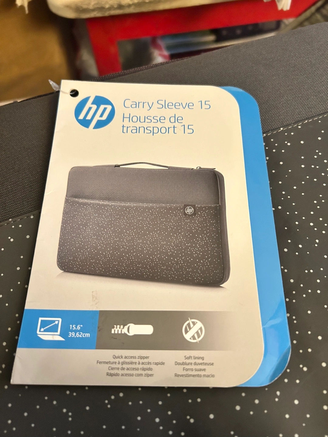 Grey laptop sleeve. Fits 15.6 inch laptops. Soft lining. Quick access zipper. Subtle dot pattern.
