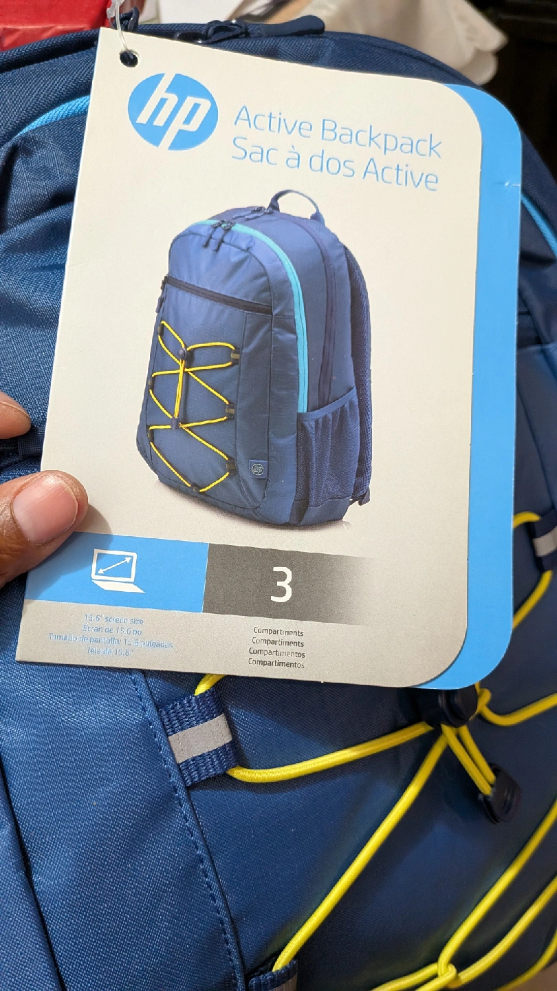 This is an HP Active Backpack in blue! It has yellow accents and a laptop sleeve inside. It's in great condition and ready for a new owner!