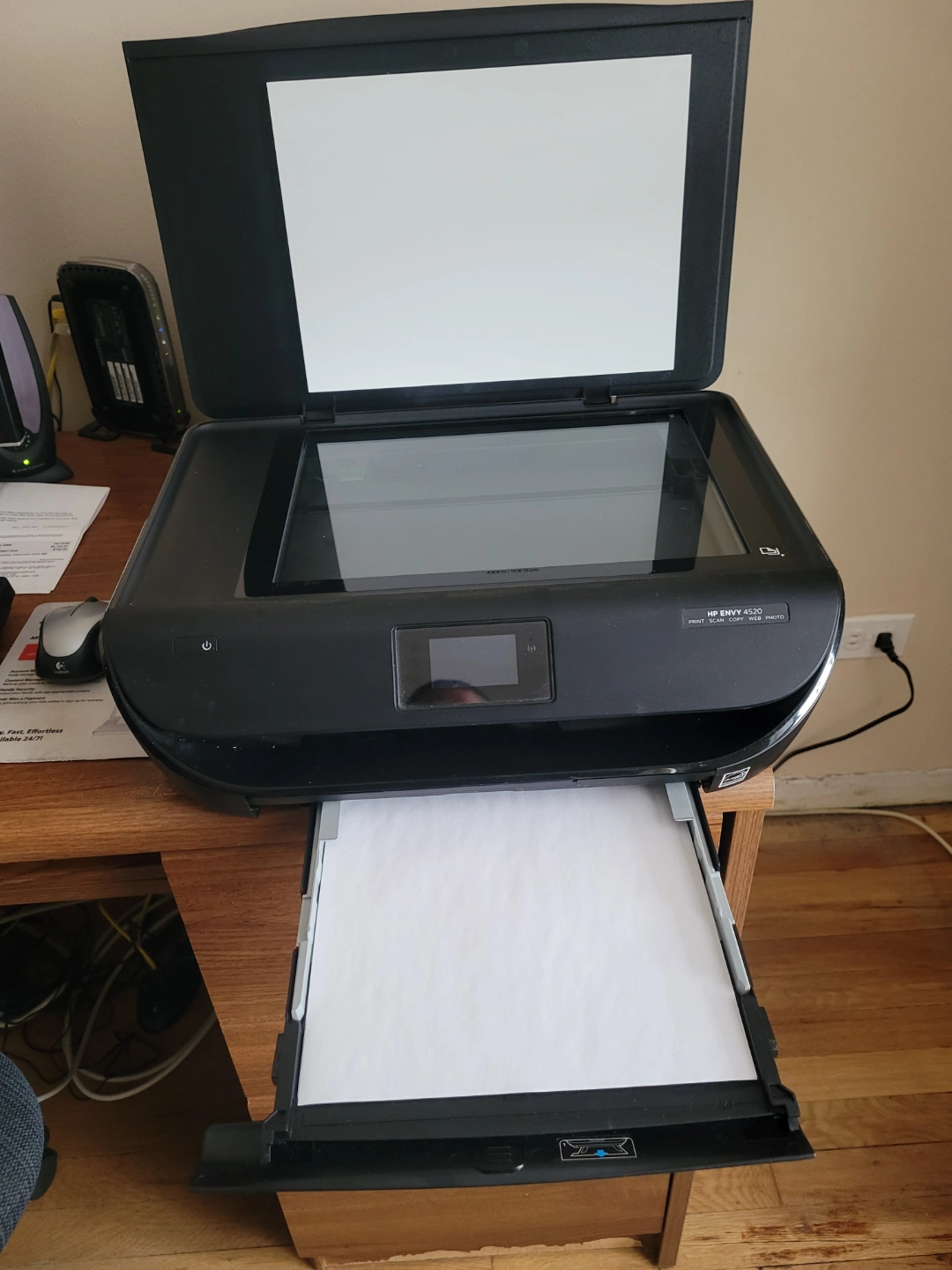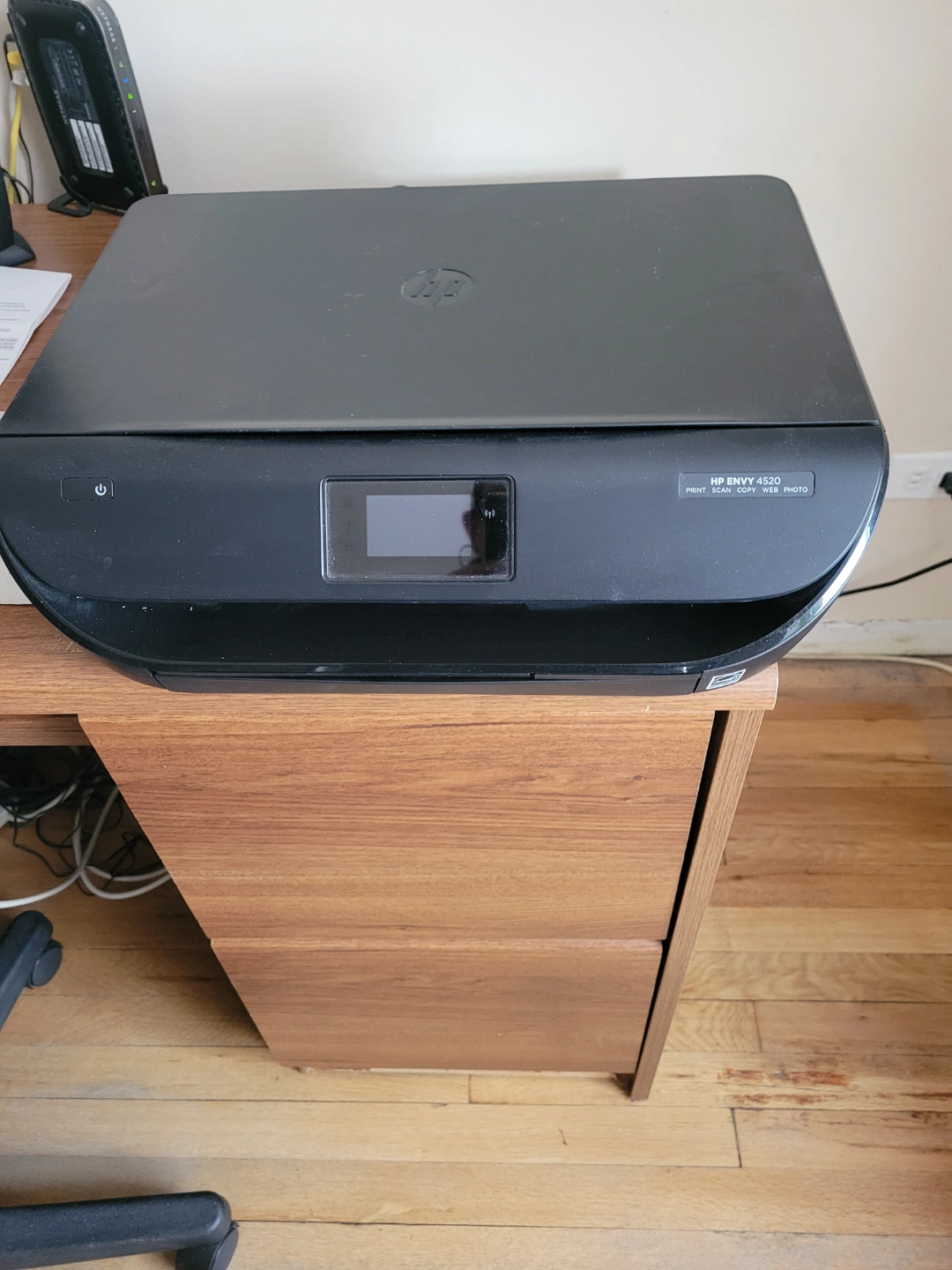 Wireless all-in-one printer. Prints, scans, and copies. Includes a touchscreen display. Used condition. Needs ink