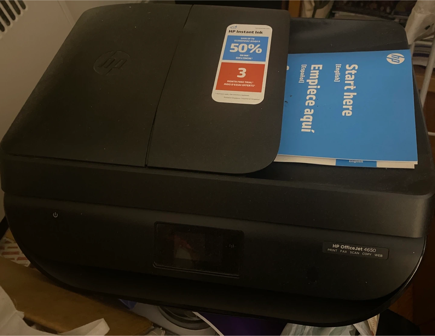 10Selling an HP OfficeJet 4650 printer. It can print, fax, scan, copy, and connect to the web. Comes with the 'Start here' guide.