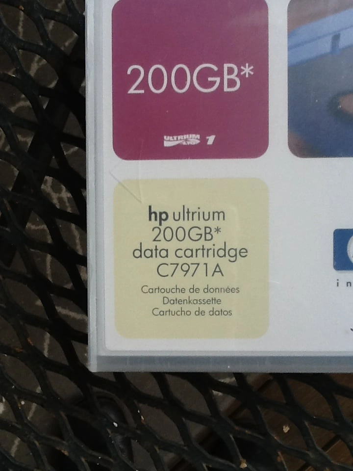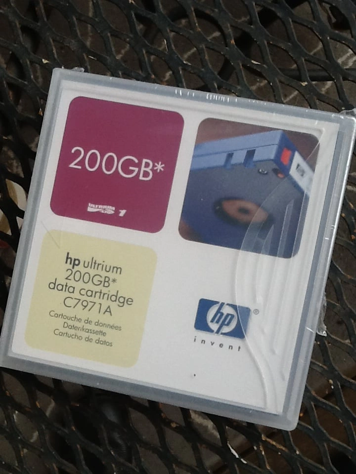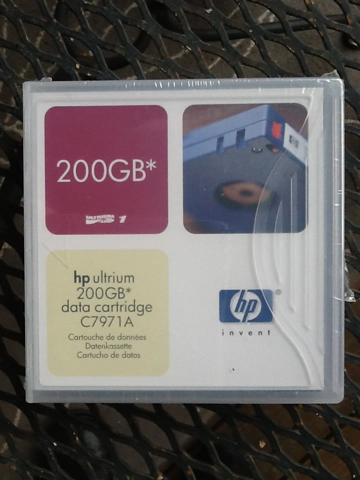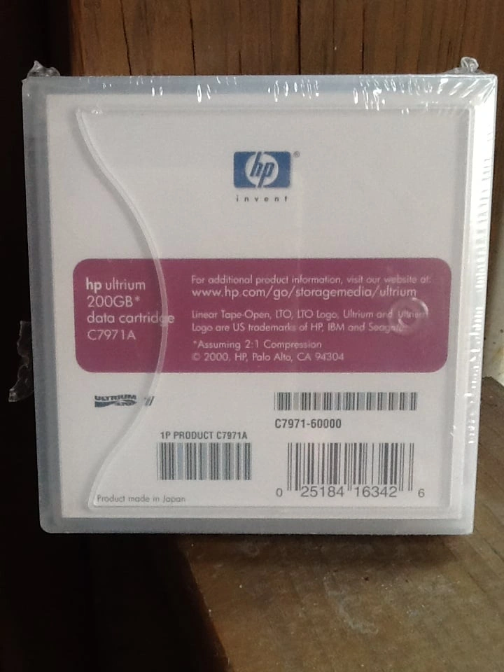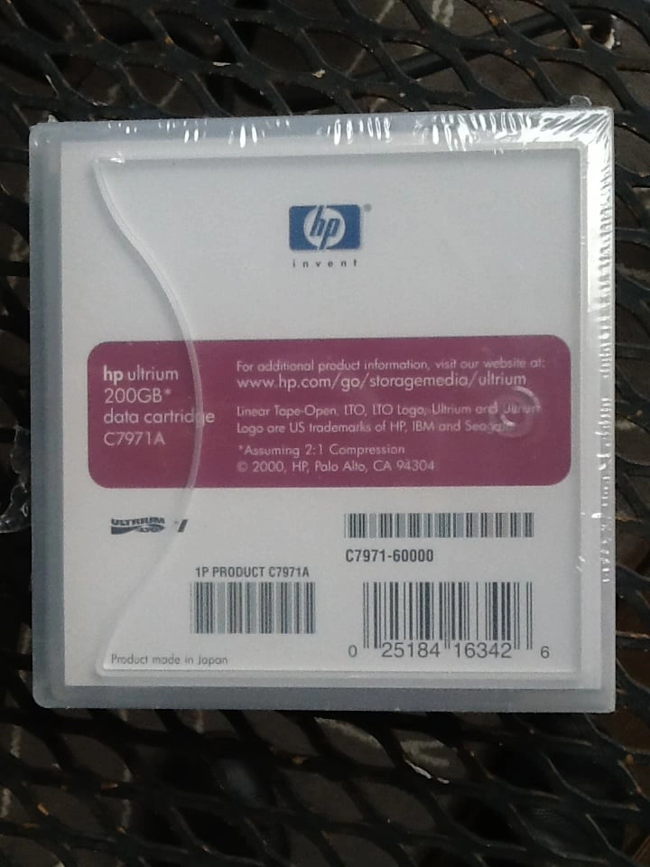 HP Ultrium Data Cartridge C7971A 200GB - New And Factory Sealed Designed to withstand over 1 million passes and provide an archival storage live of 30 years. Supports 20,000 loads/unloads. Media - Metal Particle Encoding - RLL 1.7 Tape Speed - 2.7 to 5.4 m/s Tape Length - 580m Number of tracks - 384 From a smoke and pet free home. Check out in person before purchasing. Thanks for looking.