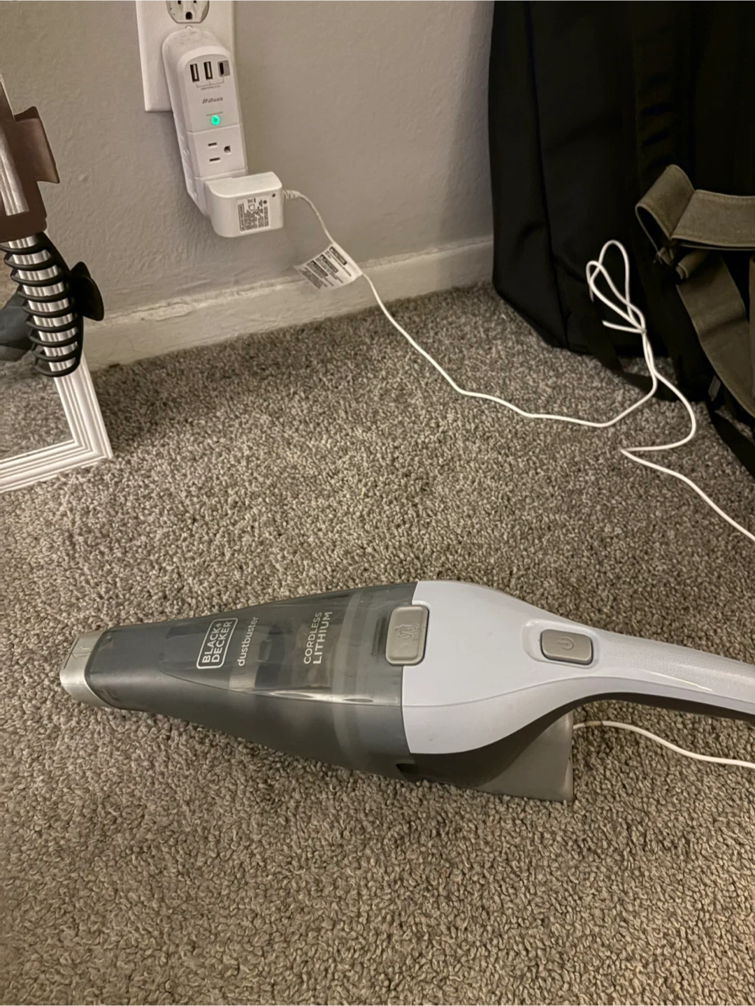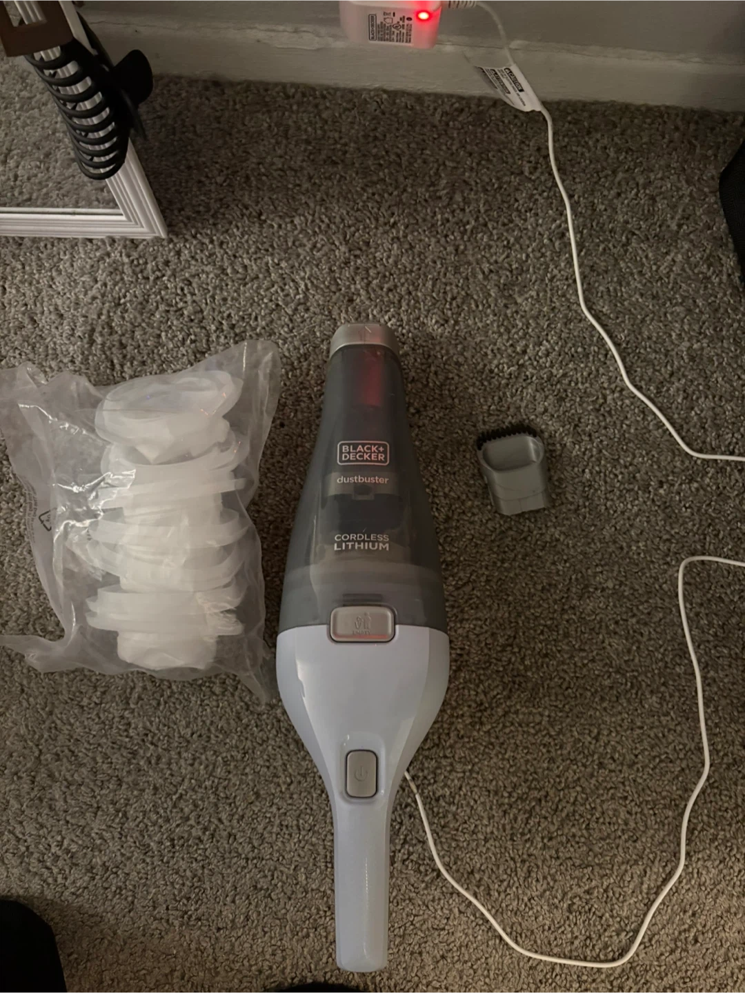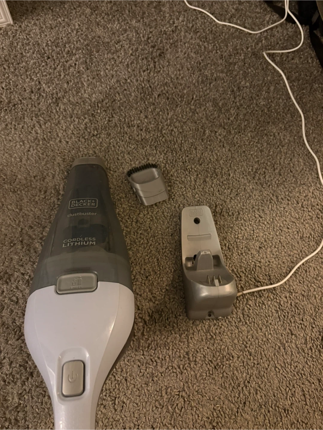 This is a Black+Decker Dustbuster handheld vacuum. It's cordless and powered by lithium-ion technology. Includes charging base and brush attachment.