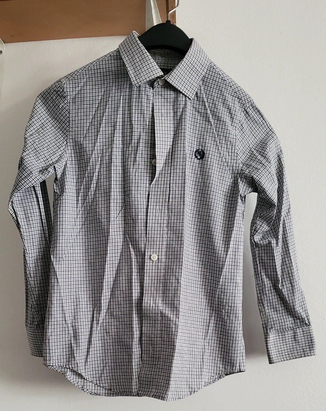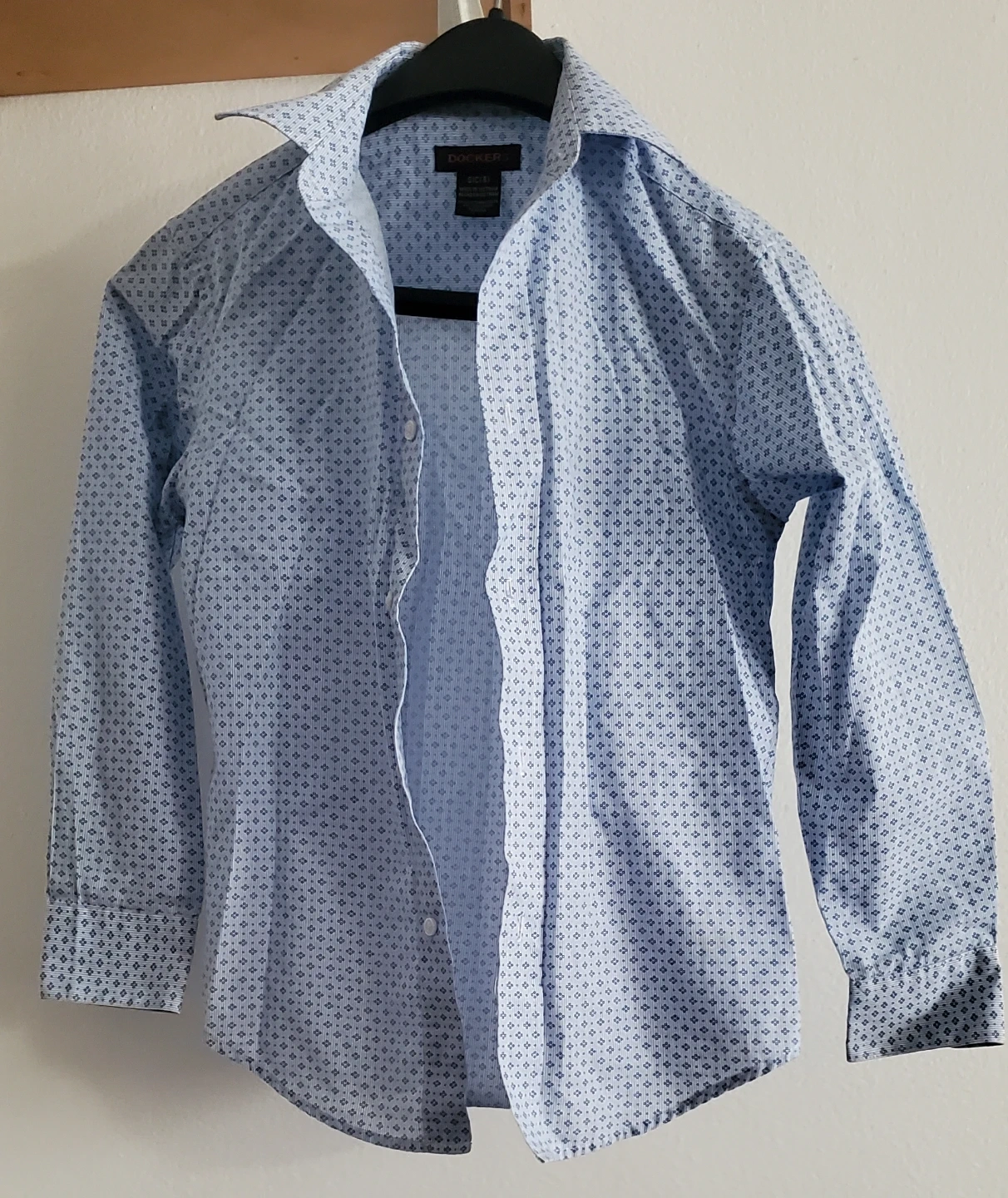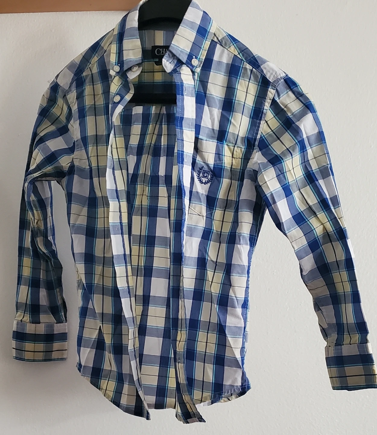 Bundle of three boys' long-sleeve dress shirts. Includes one blue plaid Chaps shirt, one black and white check shirt, and one light blue patterned Dockers shirt. Size is 8 for the first one and 10 for two others.