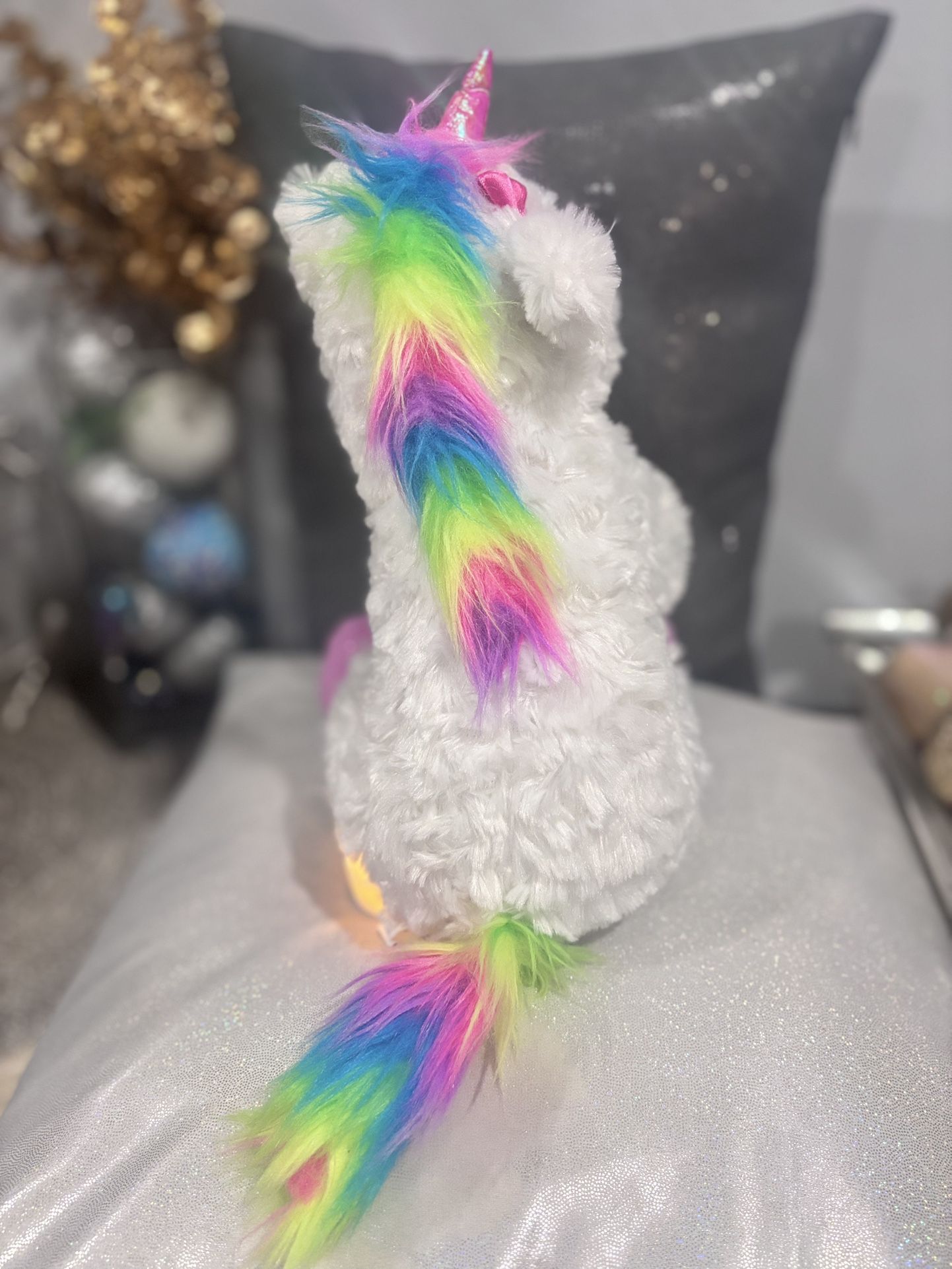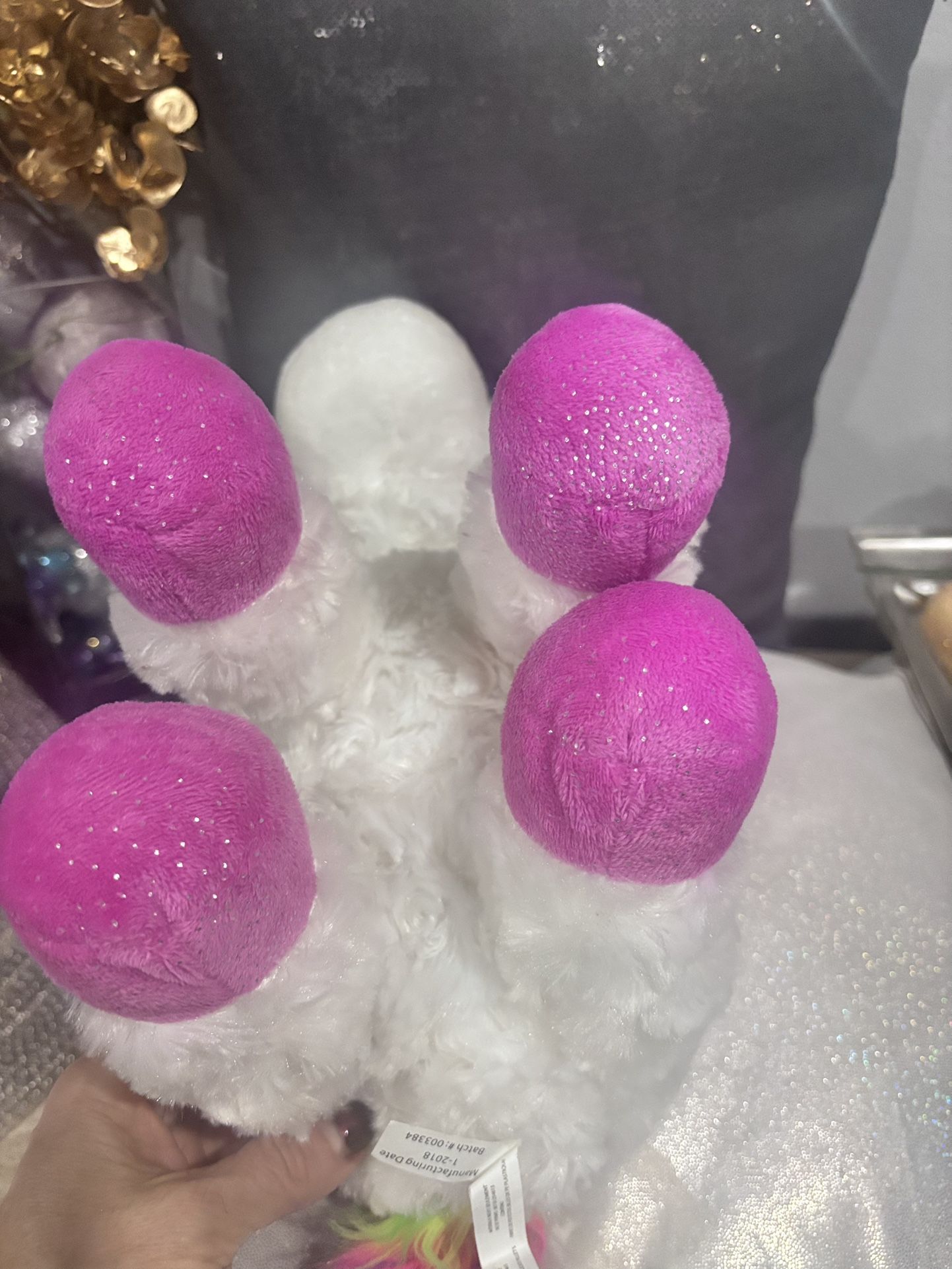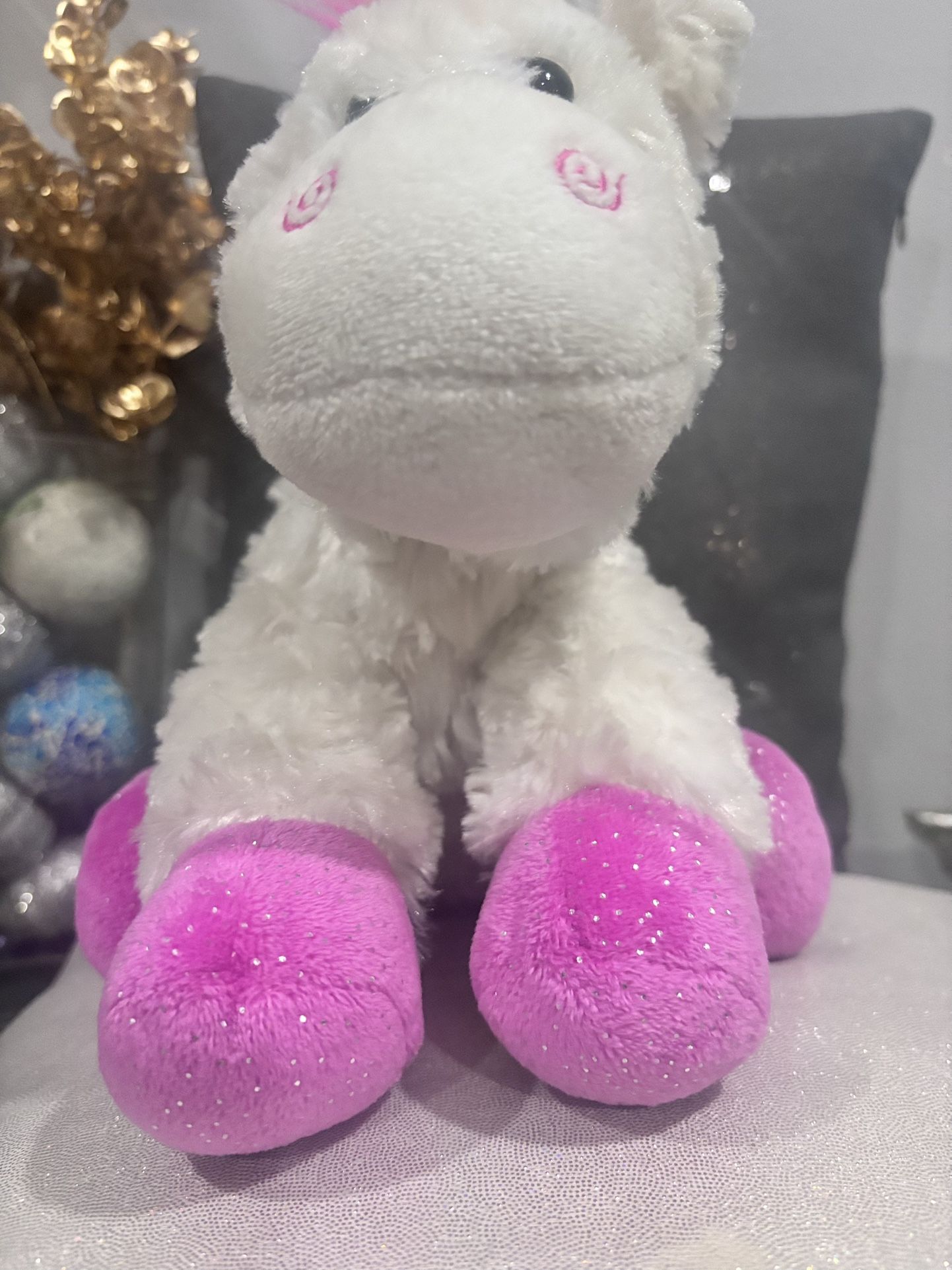 Adorable Petting Zoo unicorn plush in excellent condition. Super soft and cuddly with bright rainbow mane and tail, sparkly pink hooves, and a shiny unicorn horn. Clean and well cared for. No stains, rips, or odors. Smoke-free home. Perfect for play, display, or gifting. Size: Approximately 11 inches long. A sweet, high-quality plush that is ready for a new home! Great gift idea for unicorn lovers. Brand: Petting zoo.