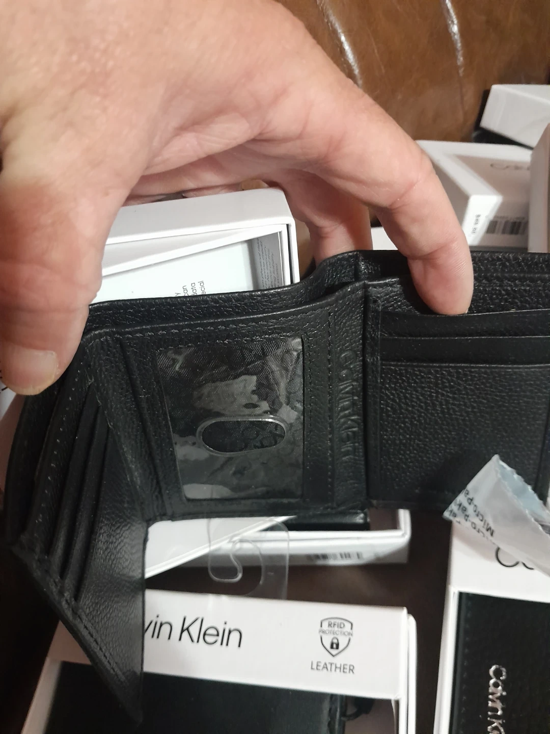 Black leather wallets and card cases from Calvin Klein. Each is in its original box and features RFID protection. Includes bi-fold wallets and a magnetic reversible card case. Great for organizing your essentials. Brand new with tags and box retails $49.50 your choice $10.00 each