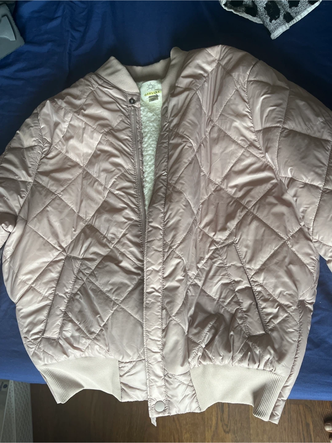 Selling an OFFLINE by Aerie quilted bomber jacket in size medium. It's a light pink color with a soft, white sherpa lining. Perfect for layering!