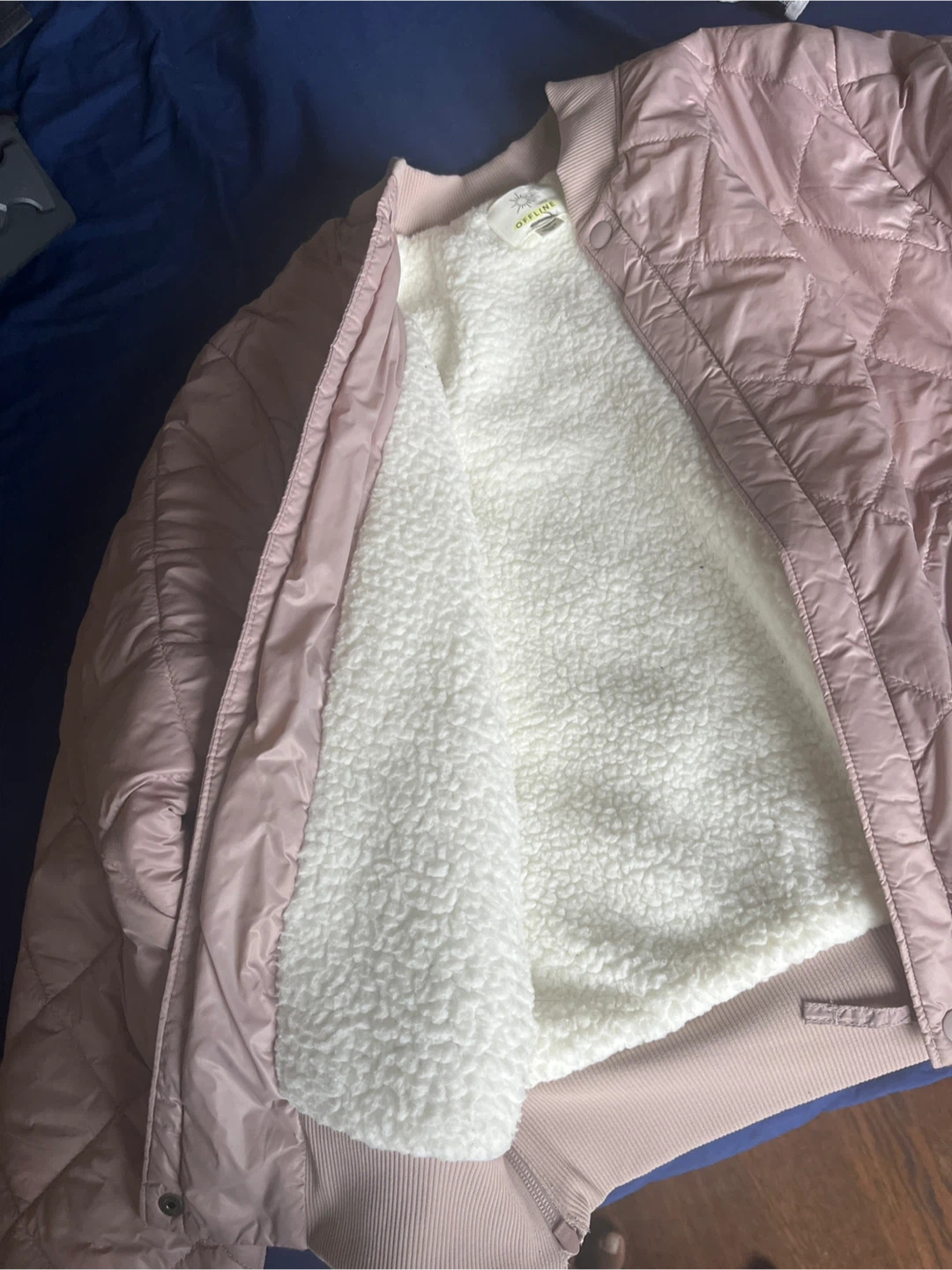 Selling an OFFLINE by Aerie quilted bomber jacket in size medium. It's a light pink color with a soft, white sherpa lining. Perfect for layering!