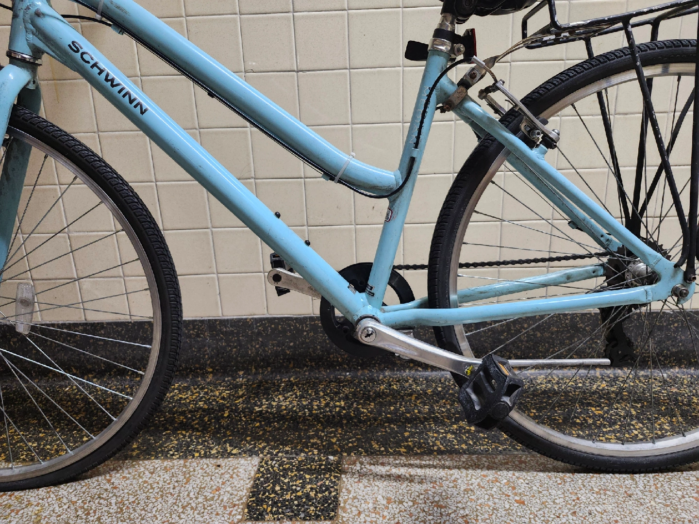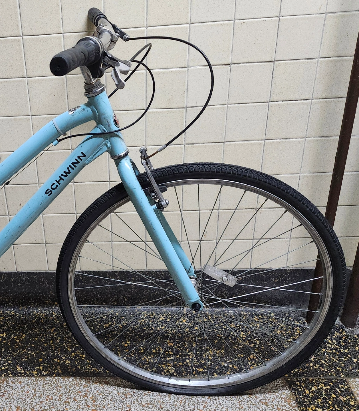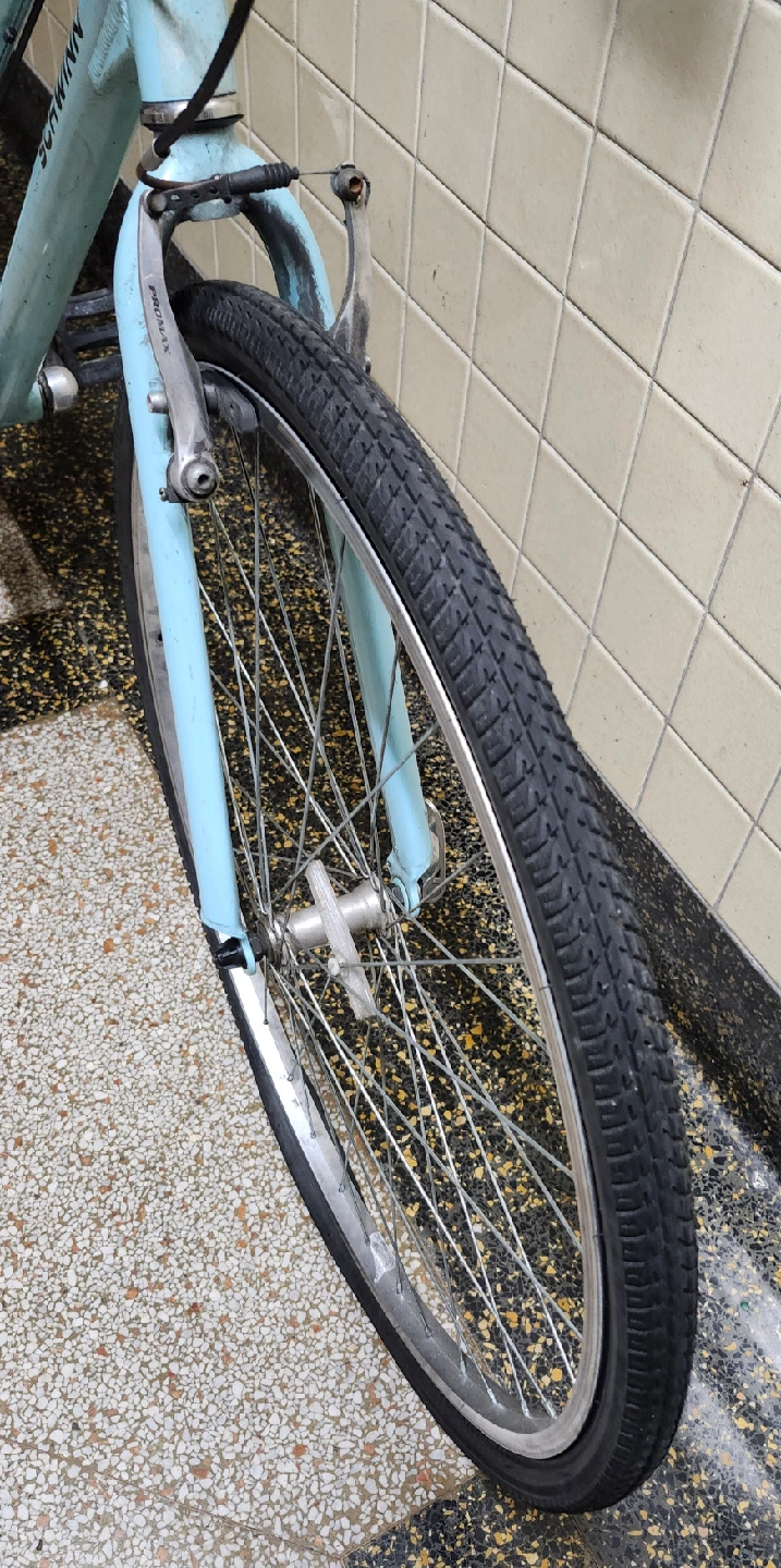 Front wheel is missing an inner tube. Brakes are in working condition, but needs to be tuned.
