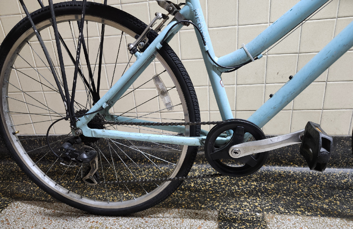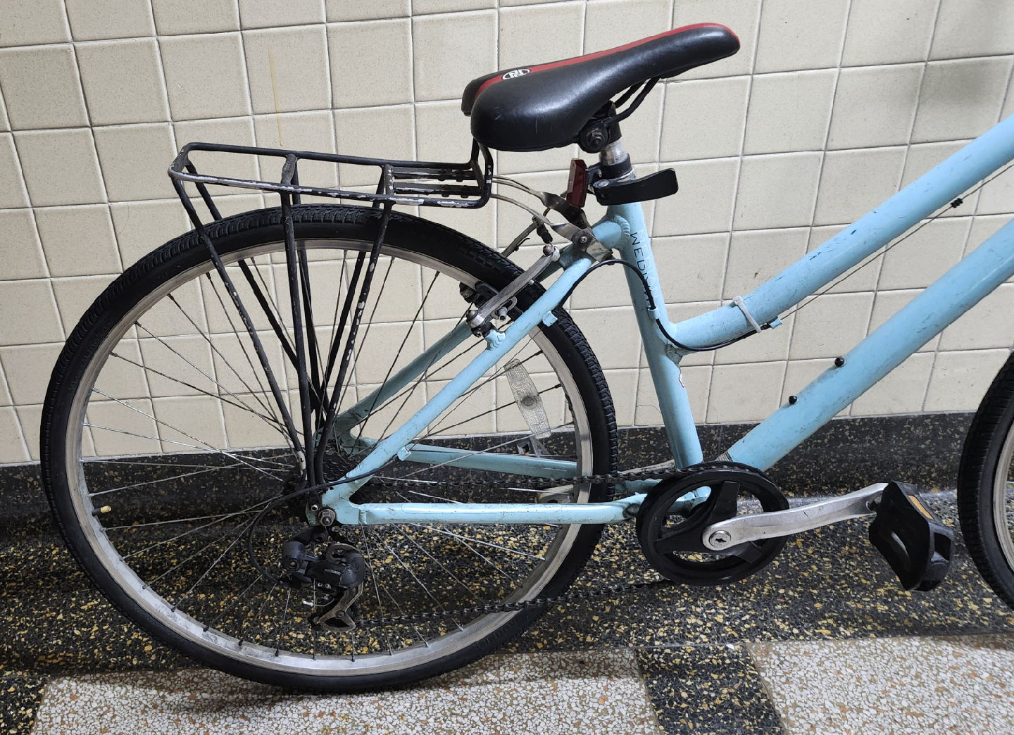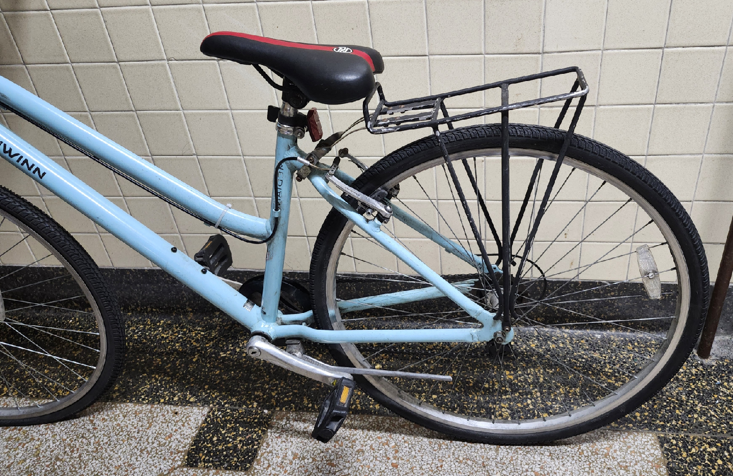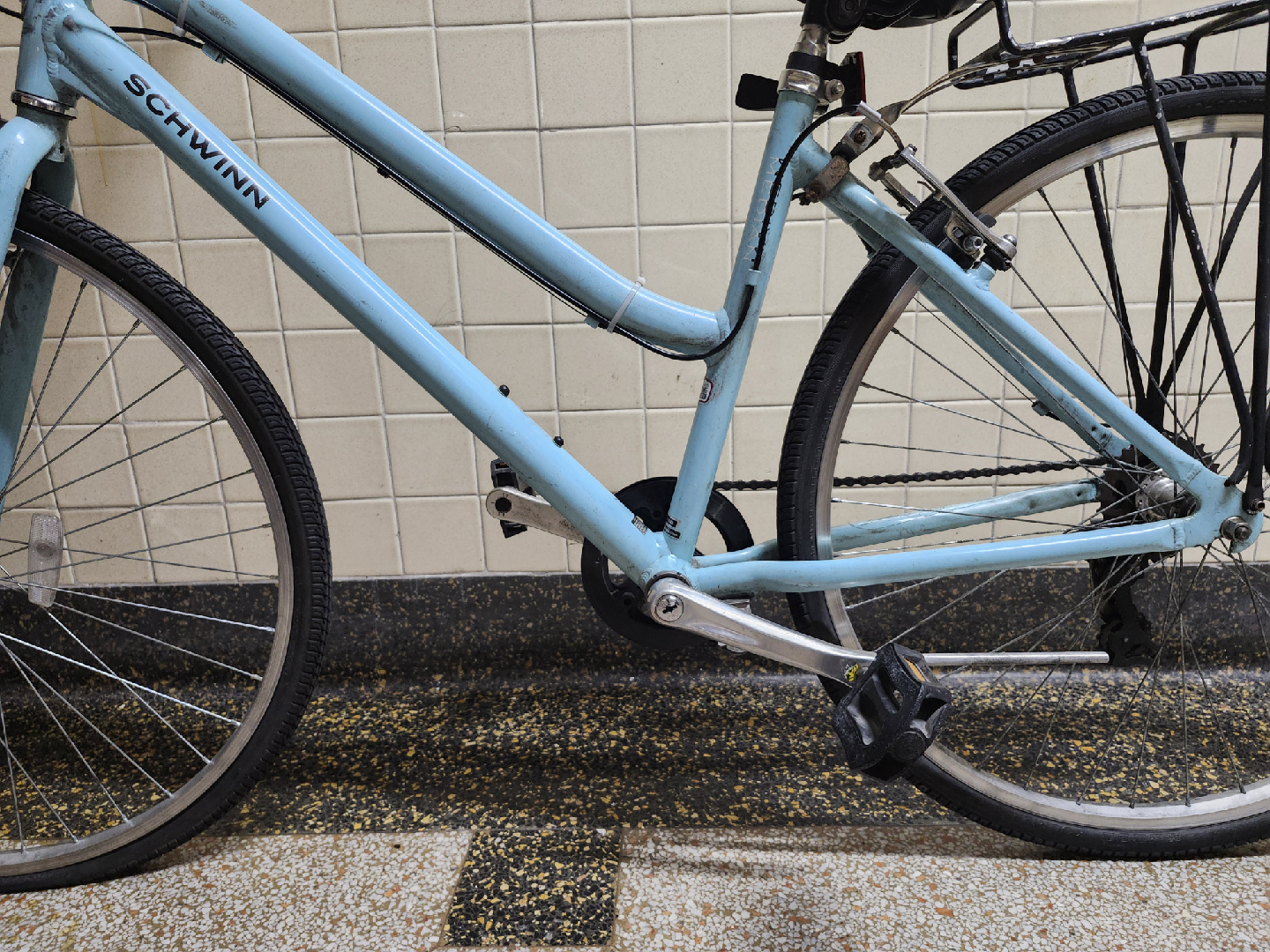 Front wheel is missing an inner tube. Brakes are in working condition, but needs to be tuned.