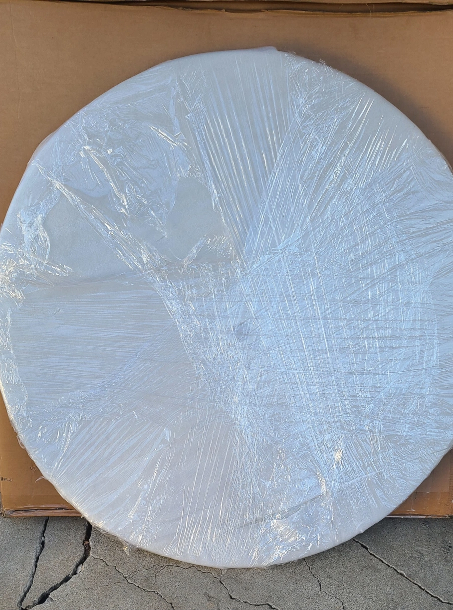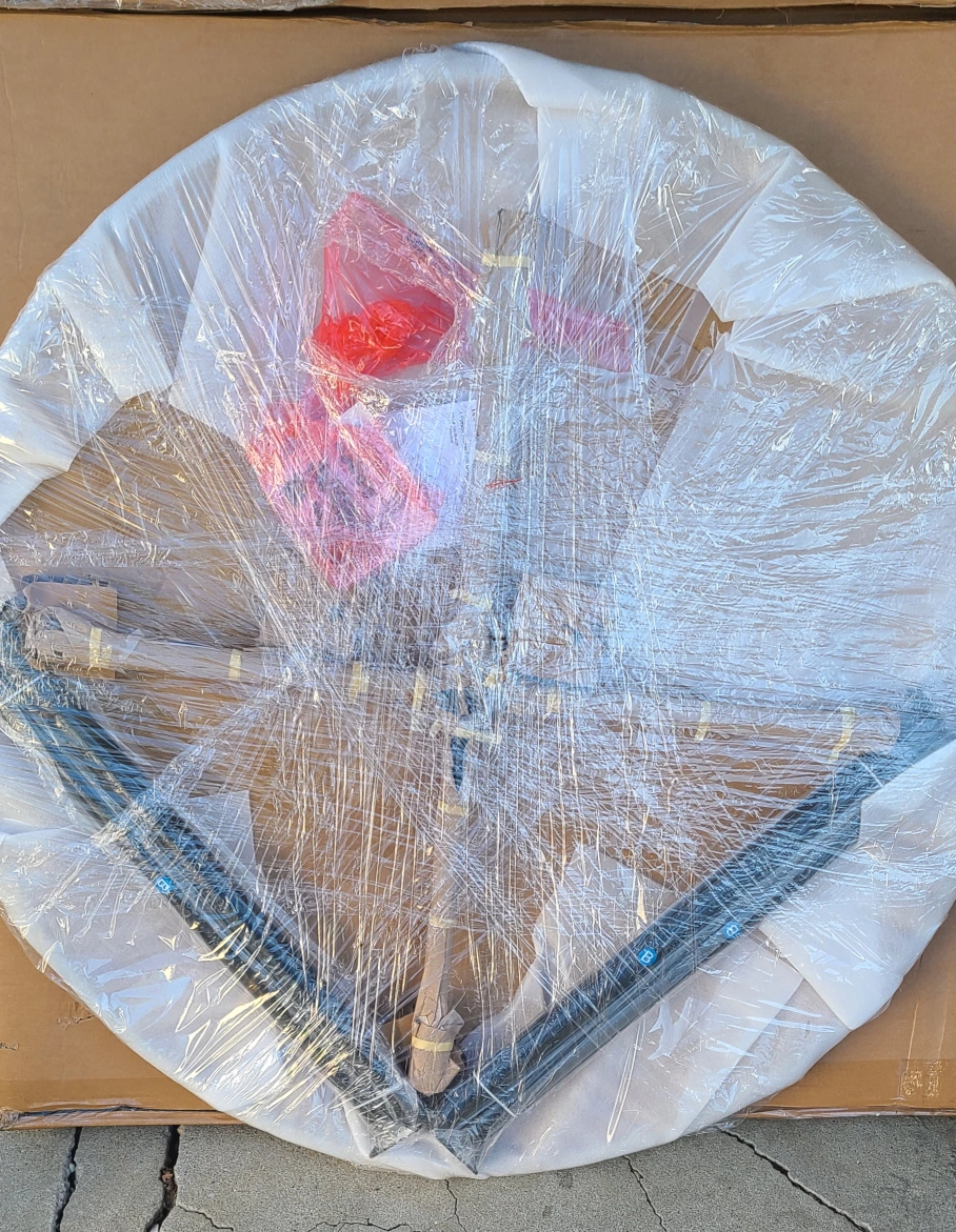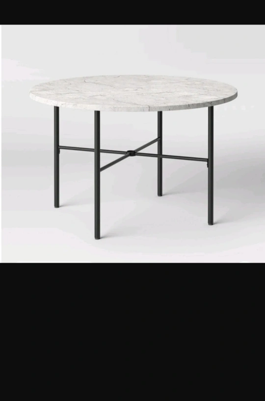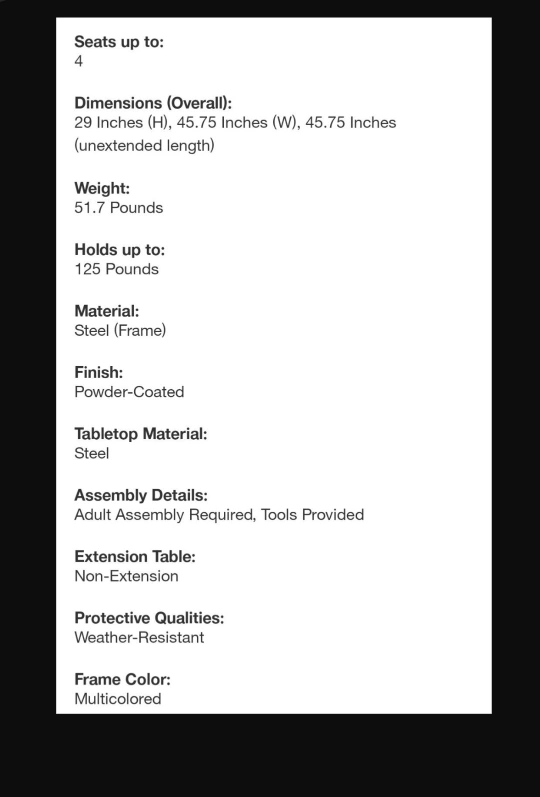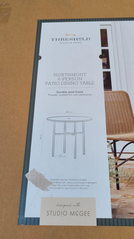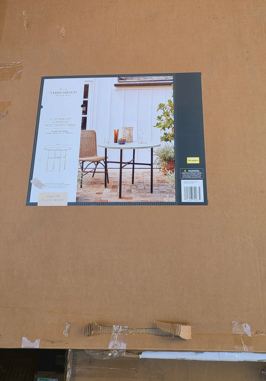 A stylish patio dining table for outdoor use, perfect for enjoying your meals in the fresh air. The table's round tabletop and sturdy legs are a durable steel construction with a powder-coated finish.