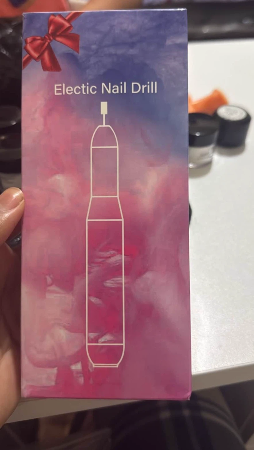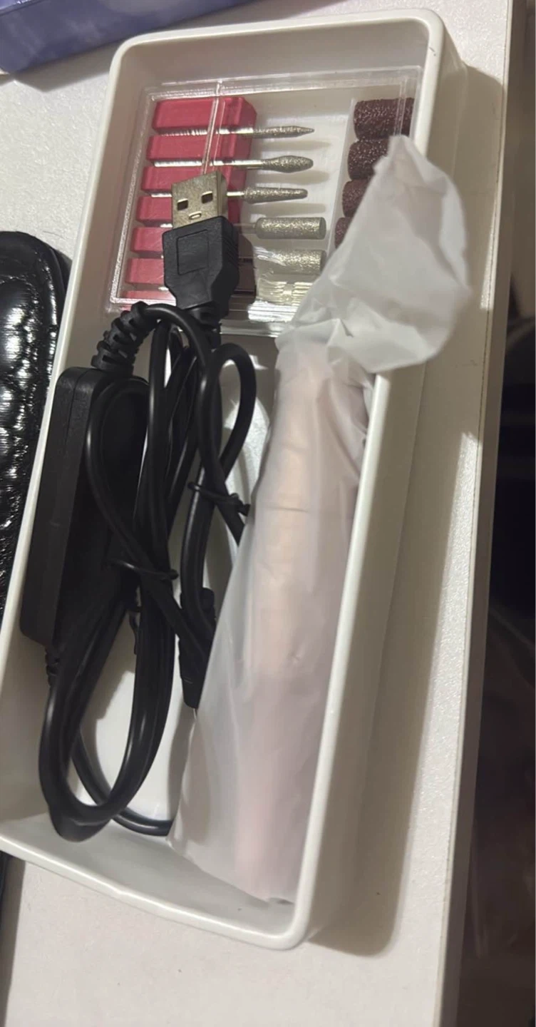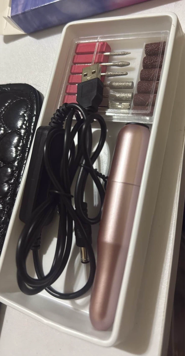 This is an electric nail drill set. It includes the nail drill pen, charging cable, and various drill bits. The pen is rose gold colored.