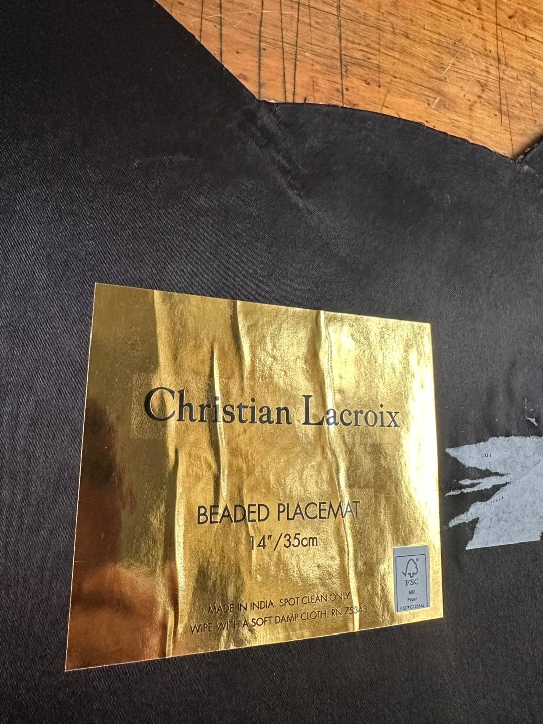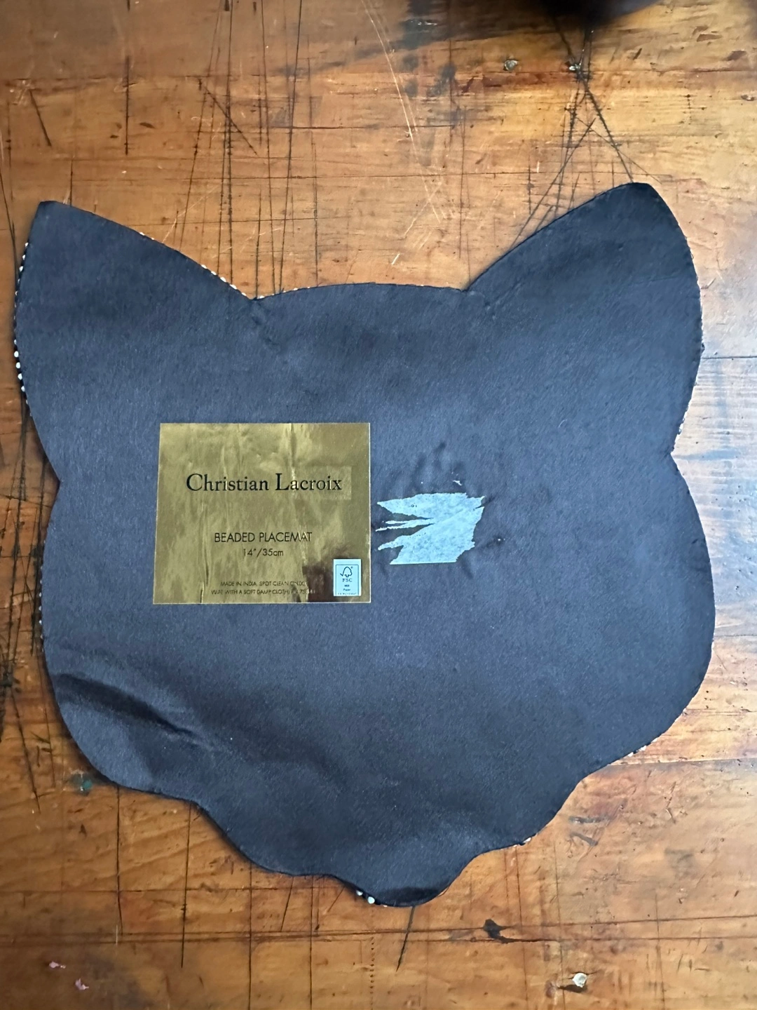 Charming beaded cat placemat by Christian Lacroix. Features striking black and blue beadwork. Perfect for cat enthusiasts. Pick up Tribeca.