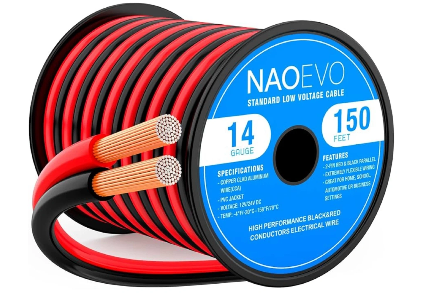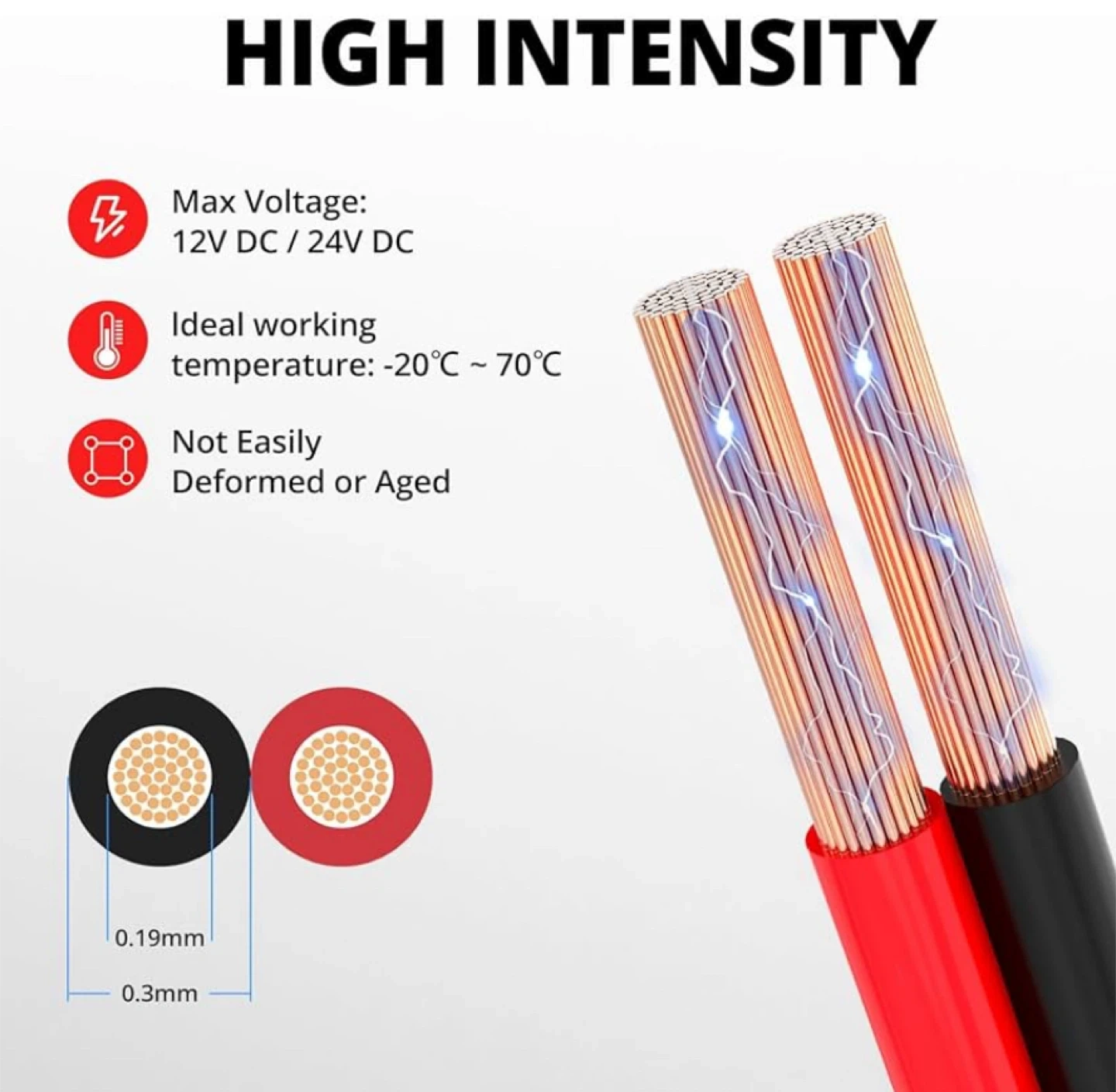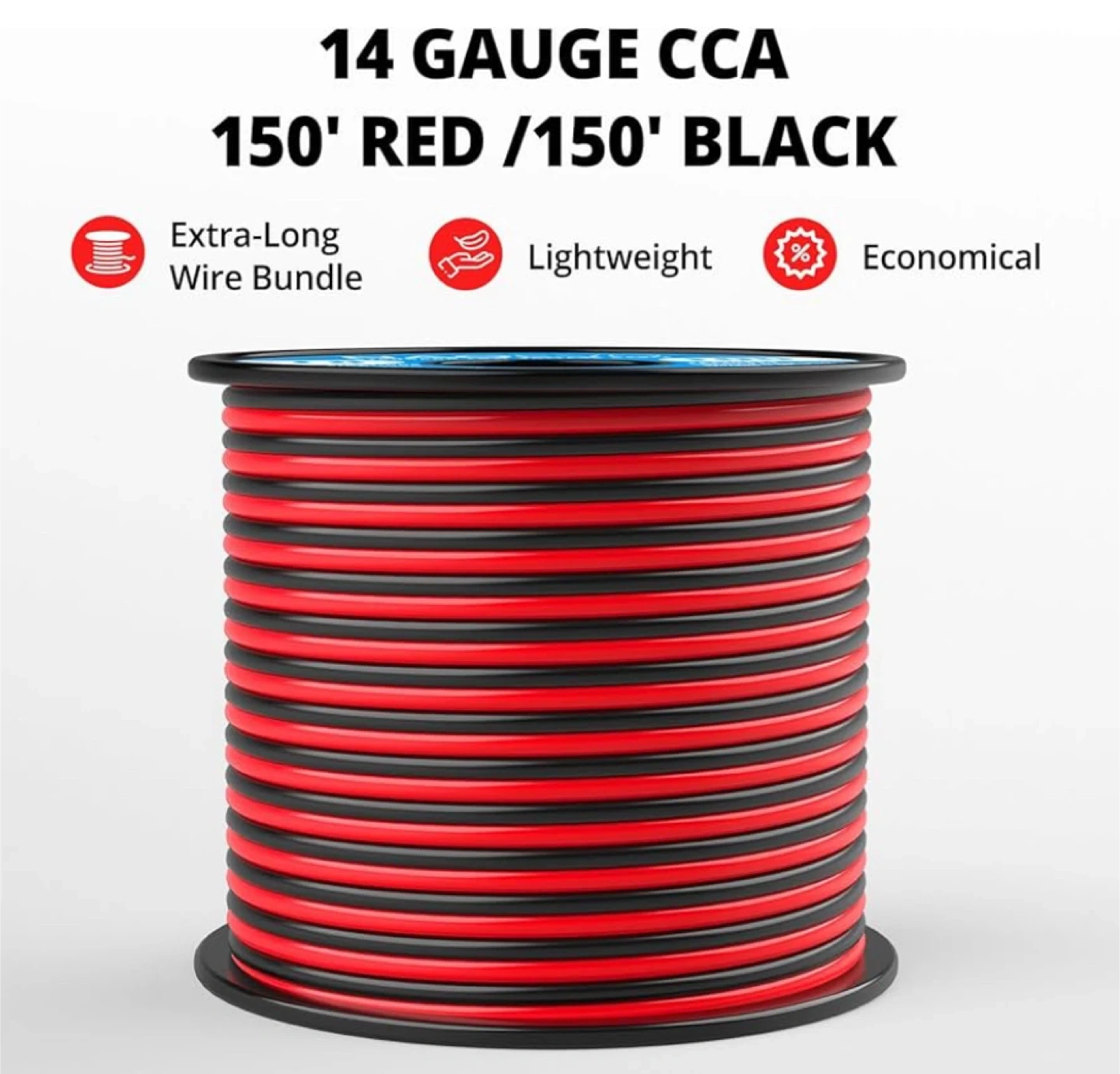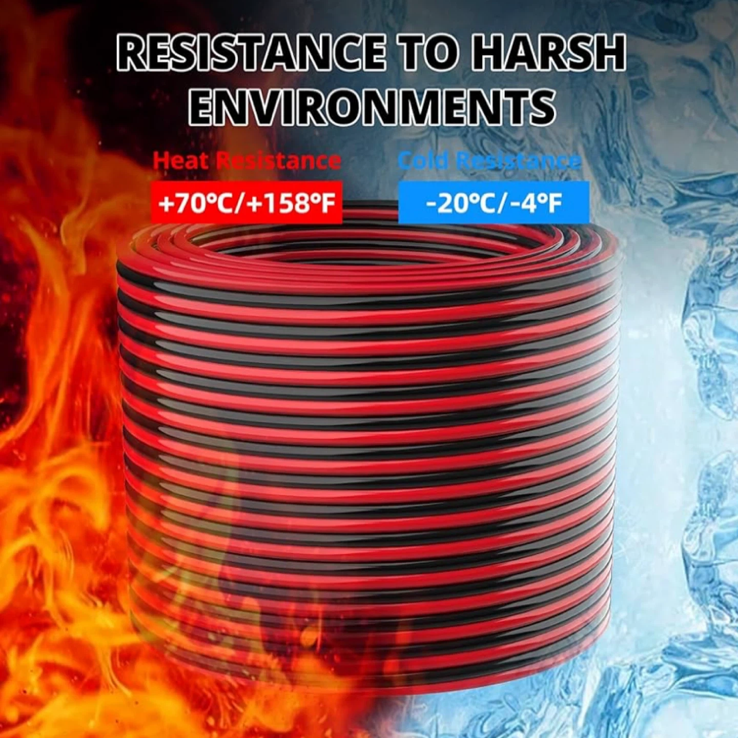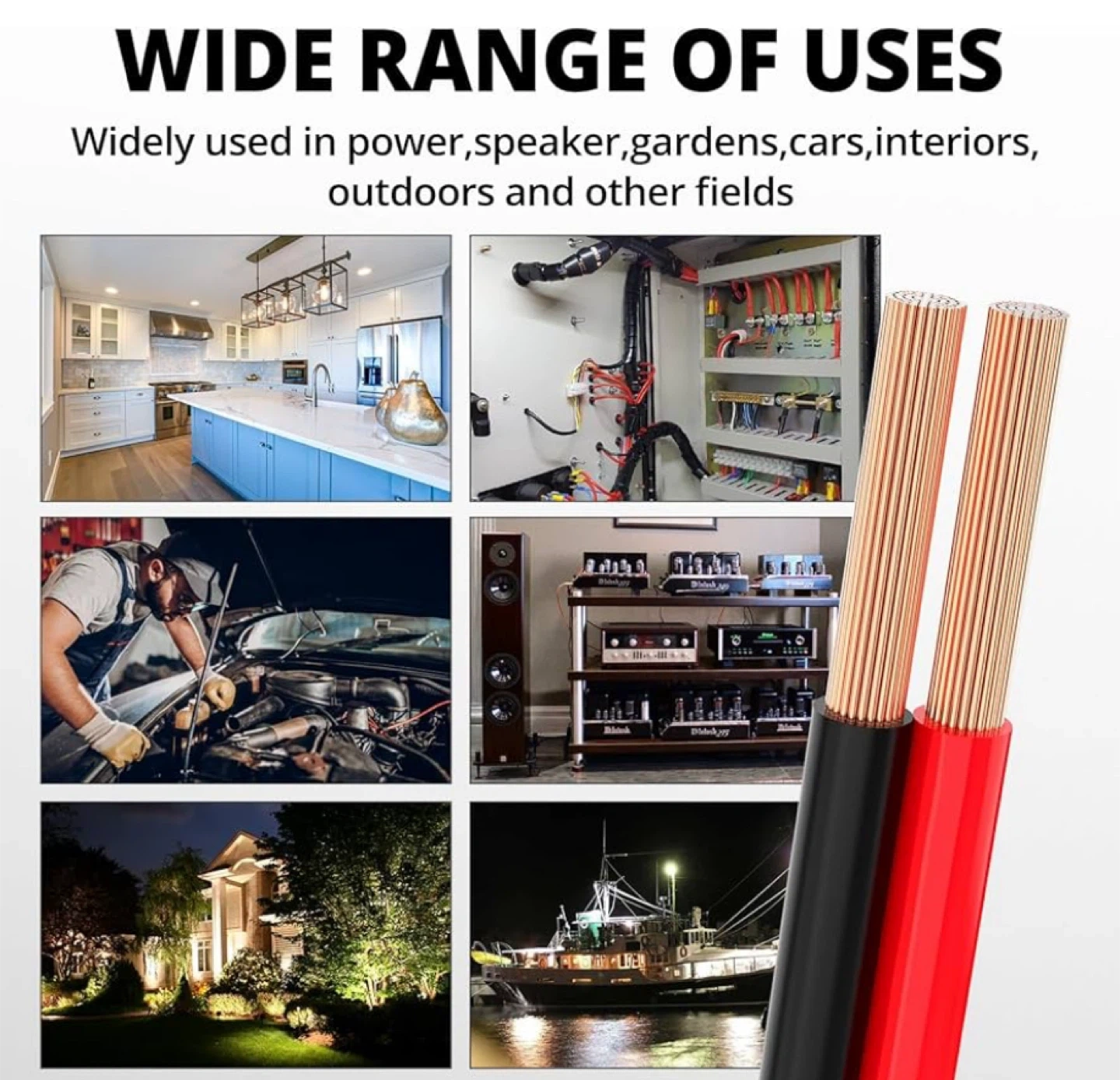 14/2 gauge black and red speaker wire is ideal for low voltage applications such as 12V/24V DC circuit connections, home or car speakers, home appliances, single color LED light strip, lamps, automotive, boat ect.