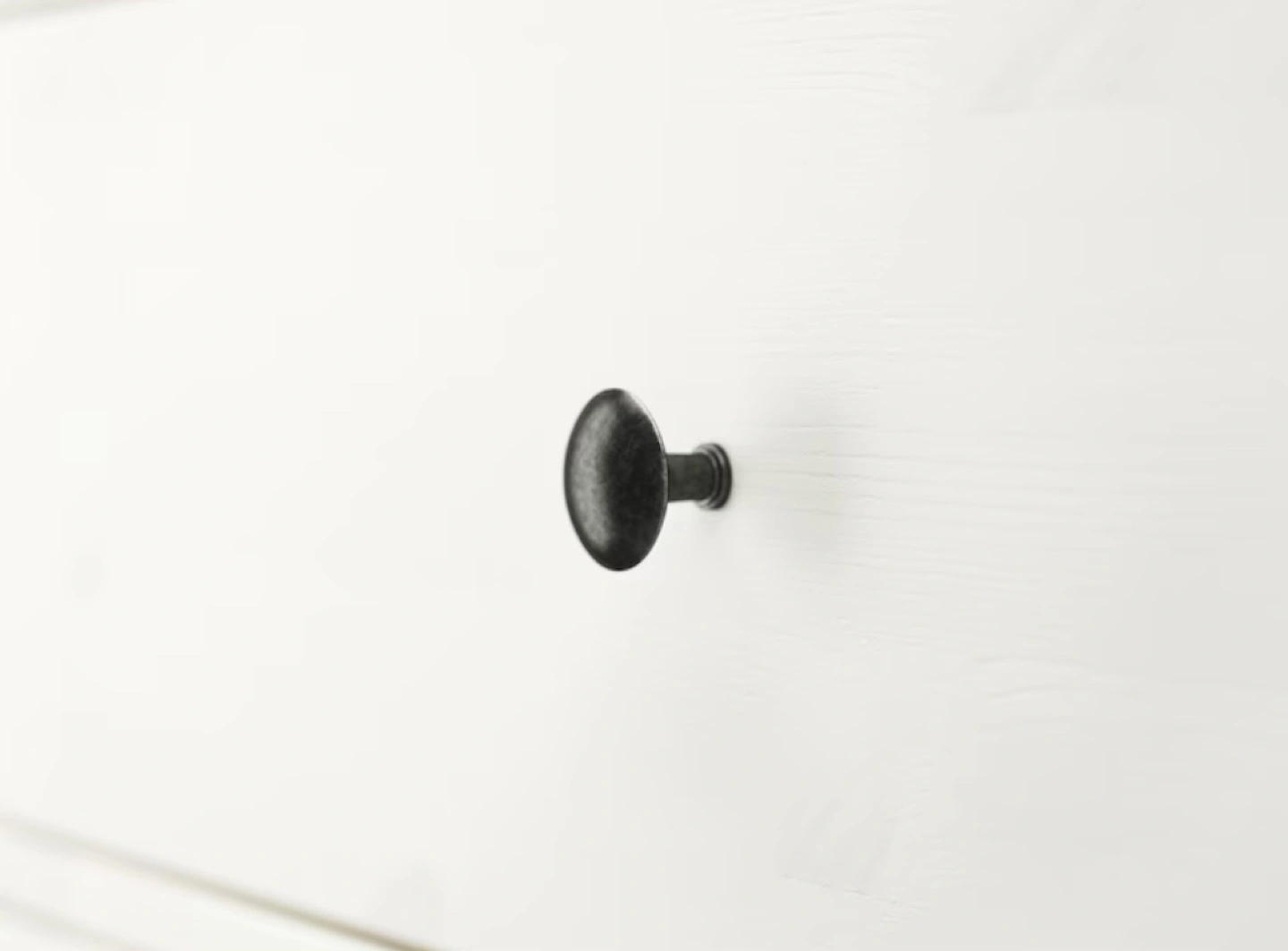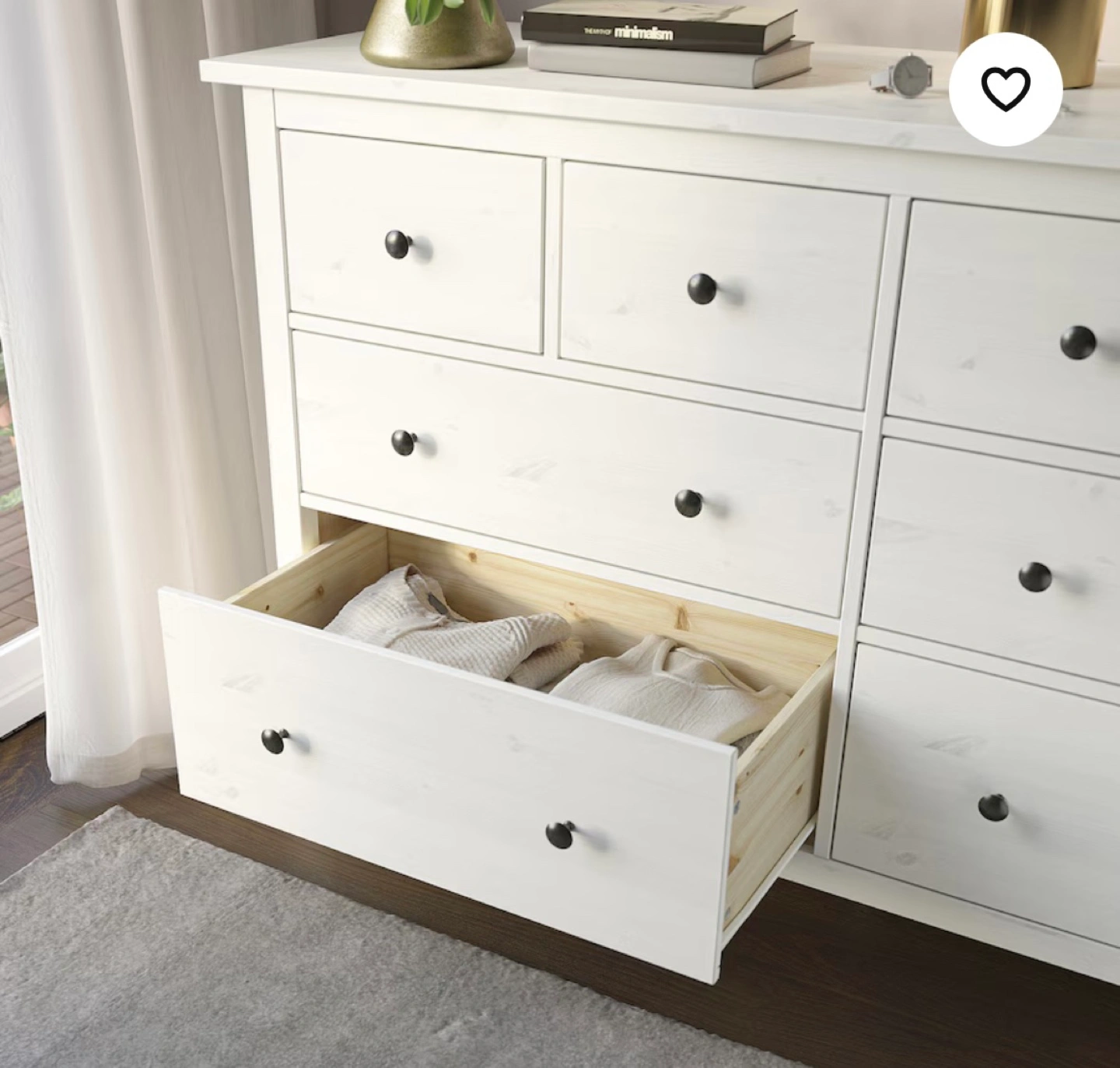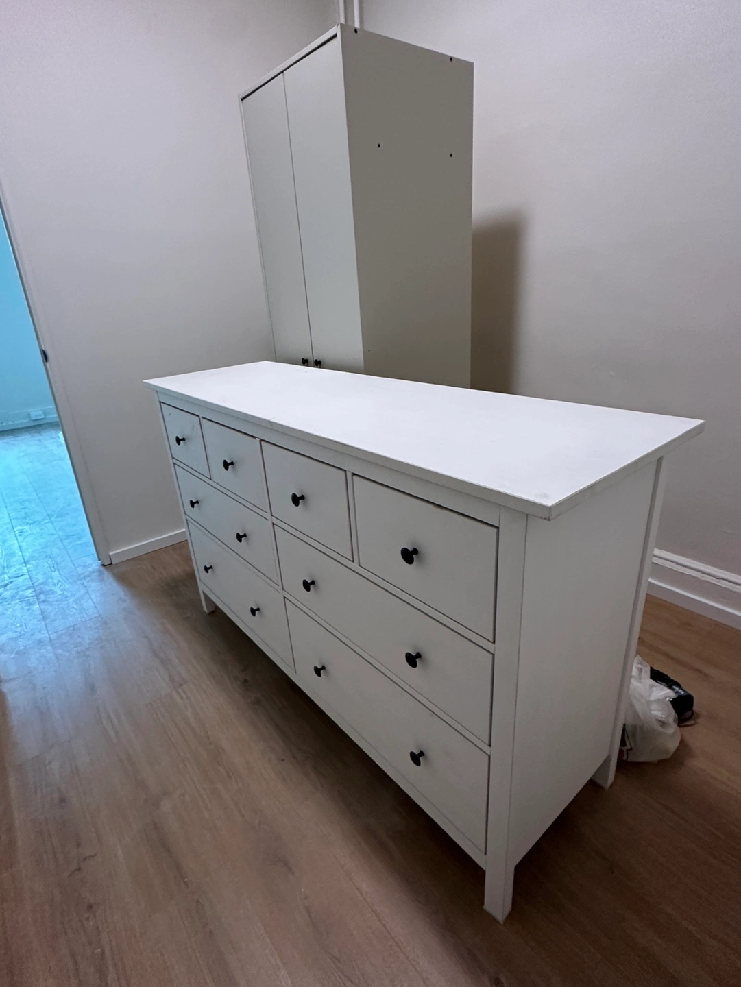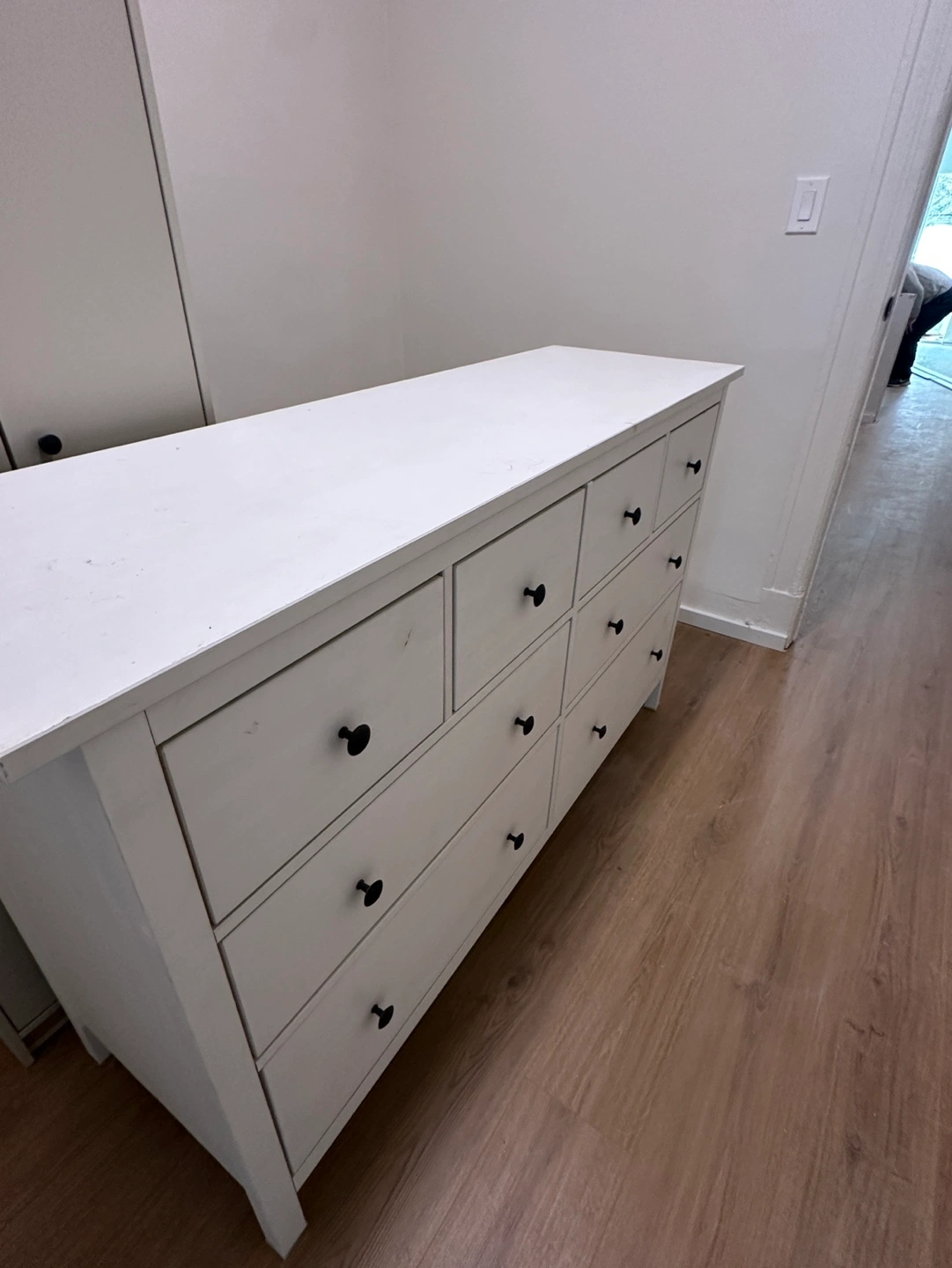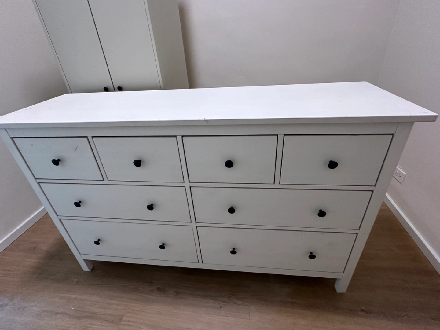 White dresser, eight drawers, black knobs. Solid wood construction. Good storage solution for bedroom or other spaces.