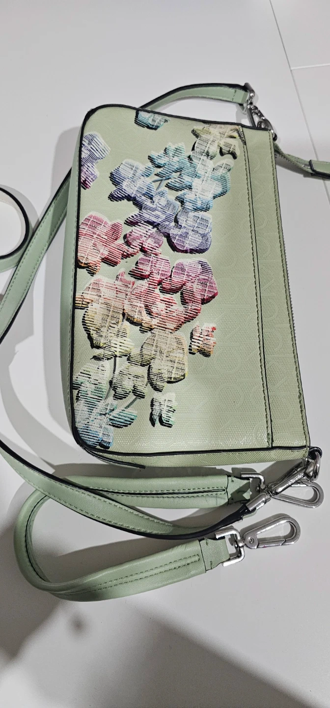 Cute Calvin Klein bag. Mint green with colorful floral design. Comes with two straps, a longer one for crossbody or shoulder wear and a smaller wristlet strap. Inside is clean, has a zipper pocket and CK logo lining....used for a few times only so hopefully can find the next lovely lady to enjoy using it π