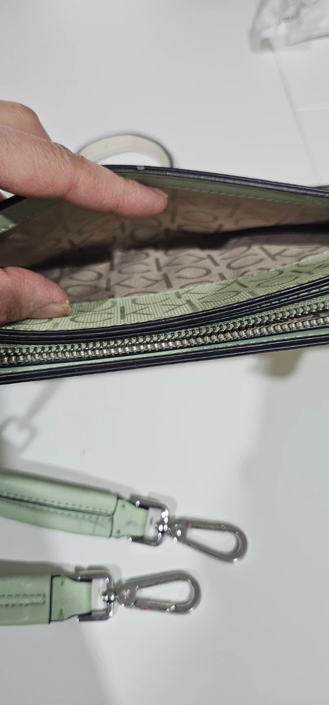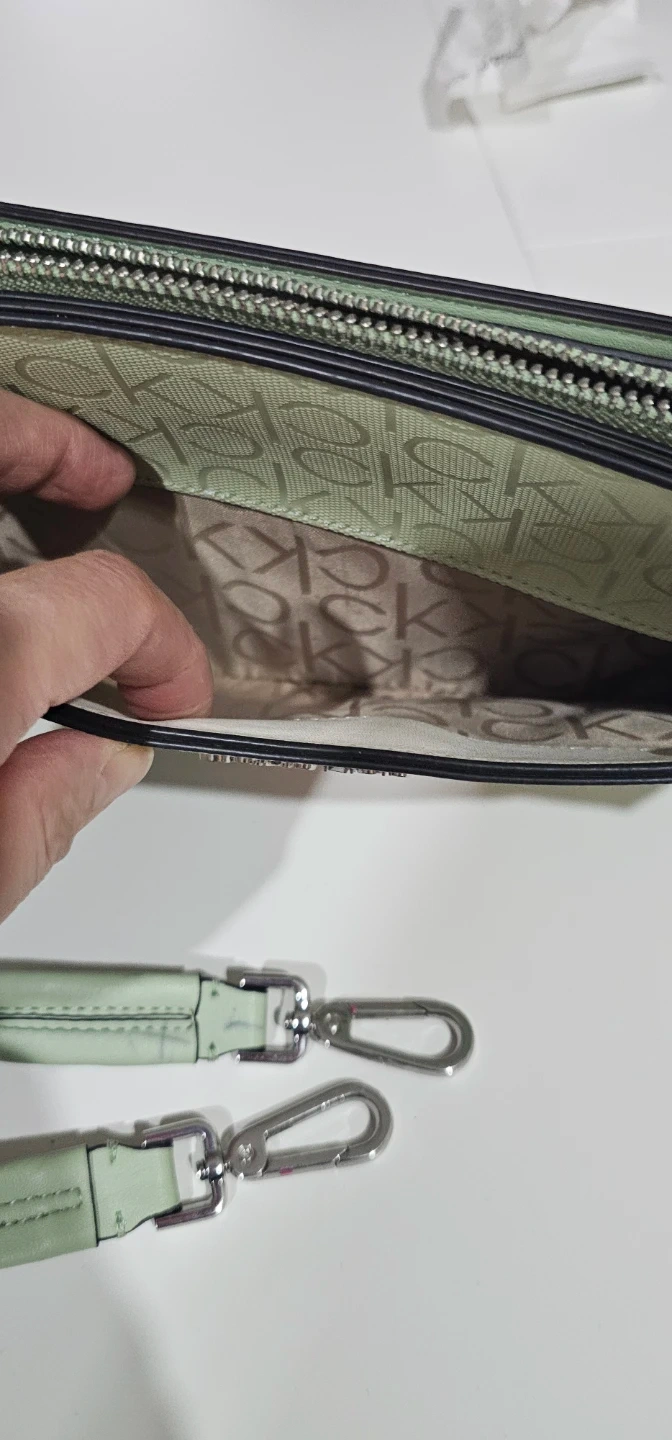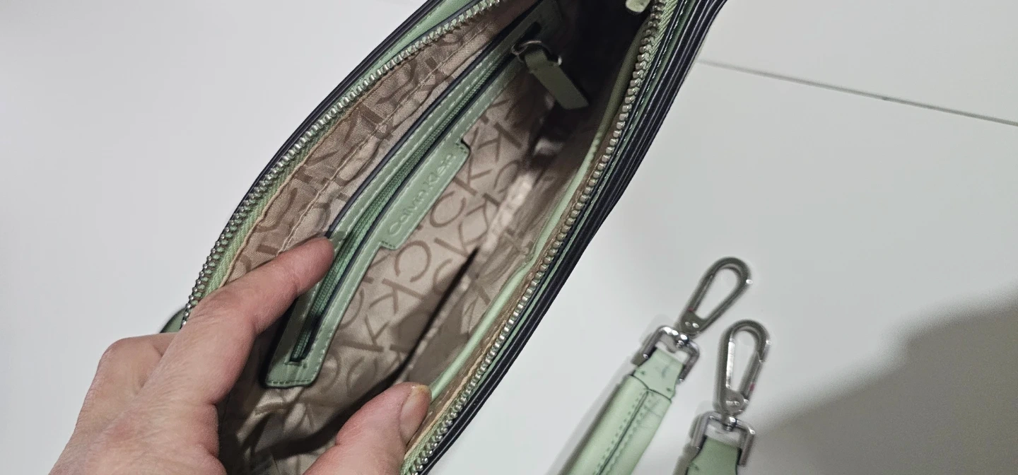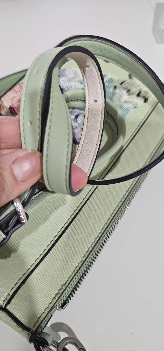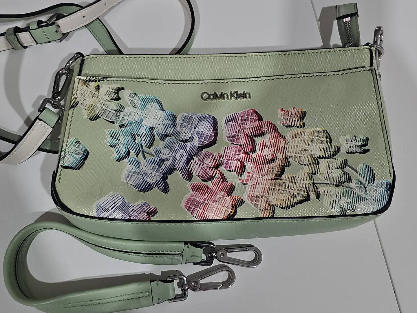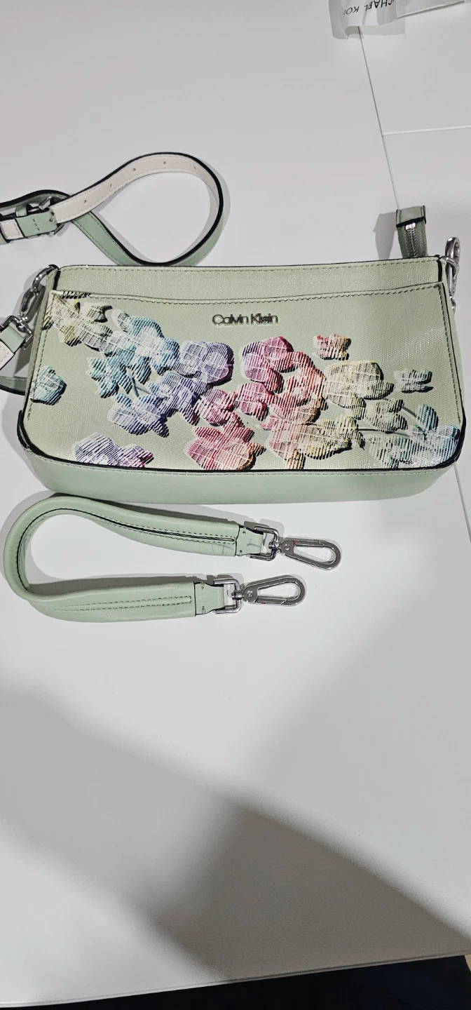 Cute Calvin Klein bag. Mint green with colorful floral design. Comes with two straps, a longer one for crossbody or shoulder wear and a smaller wristlet strap. Inside is clean, has a zipper pocket and CK logo lining....used for a few times only so hopefully can find the next lovely lady to enjoy using it π