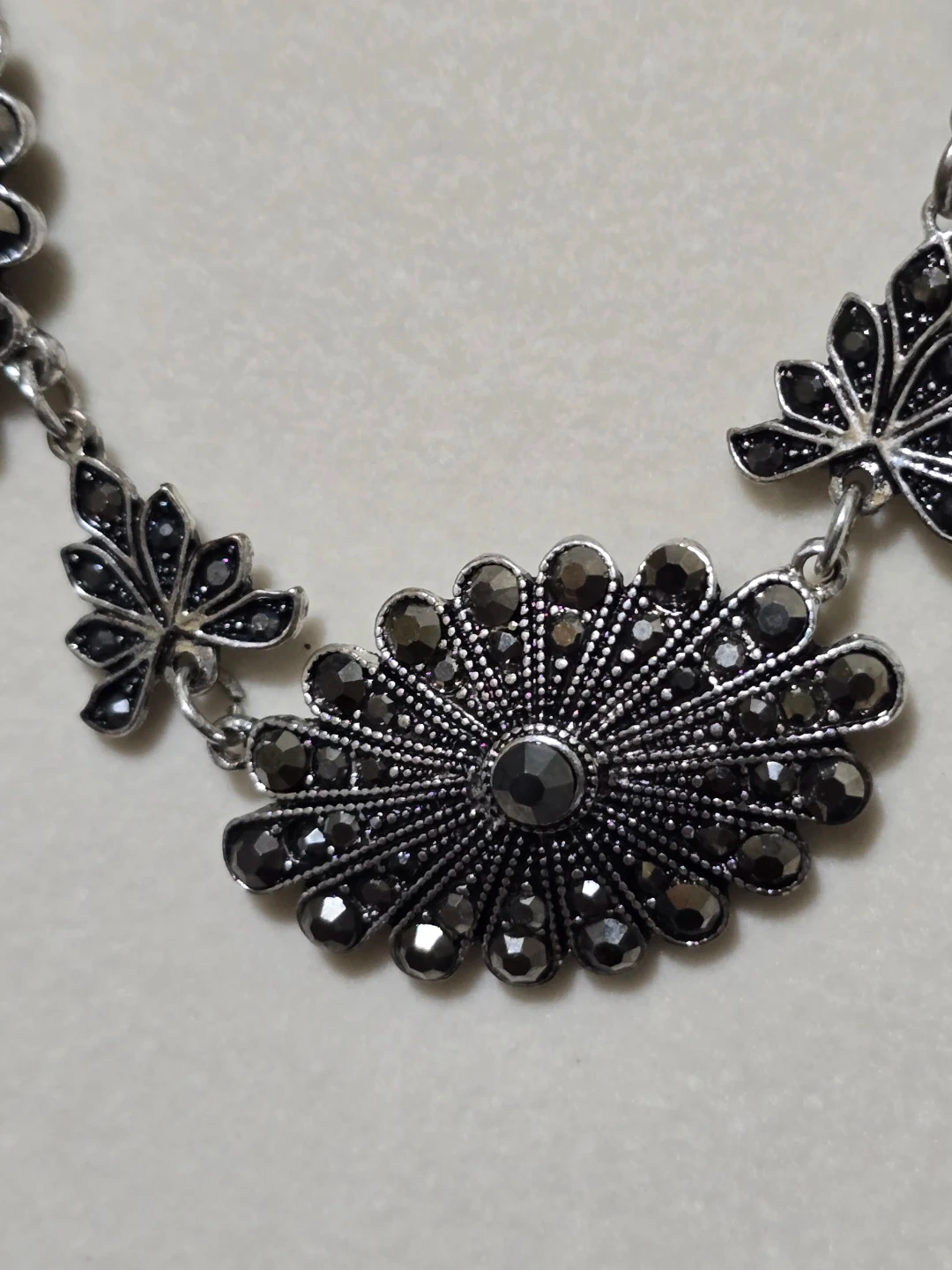 Silver tone floral statement necklace with black rhinestones