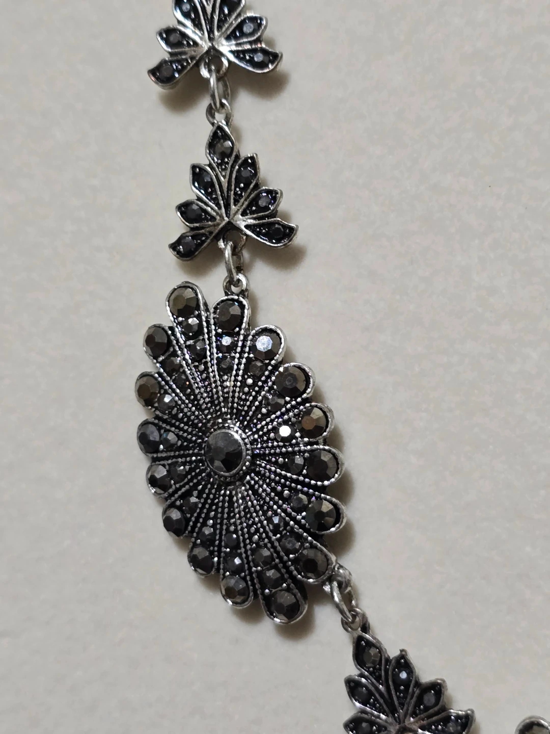 This necklace features a silver tone chain adorned with ornate floral medallions and leaf accents. The intricate design is embellished with small black rhinestones. It's a striking statement piece.