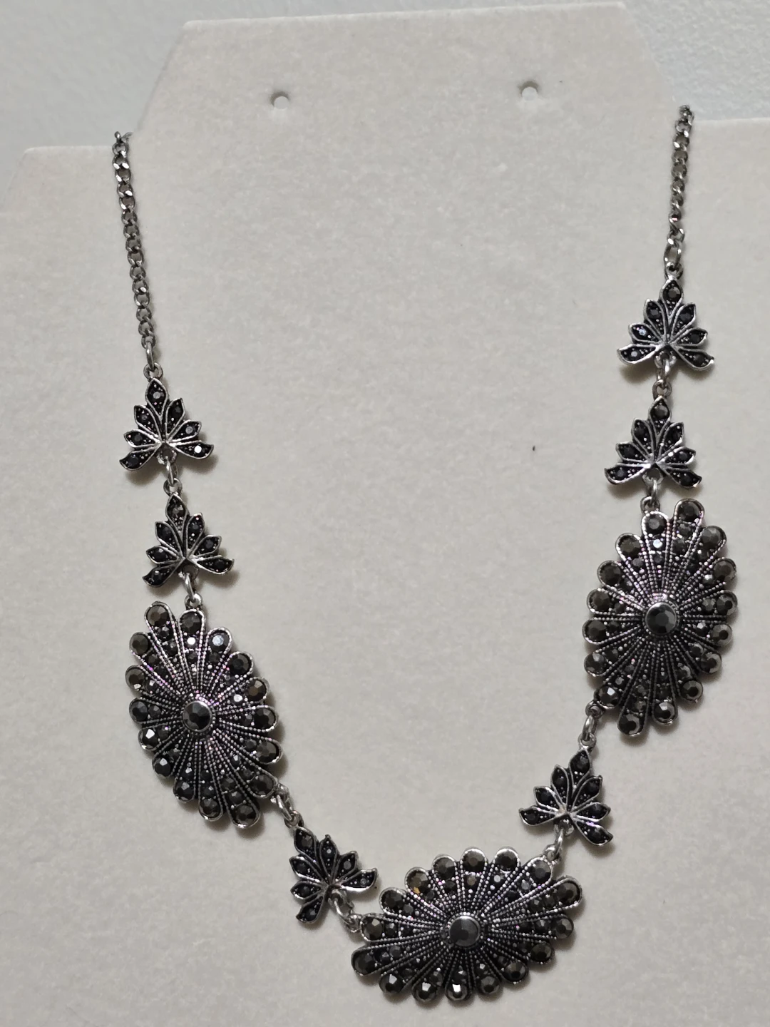 Silver tone floral statement necklace with black rhinestones