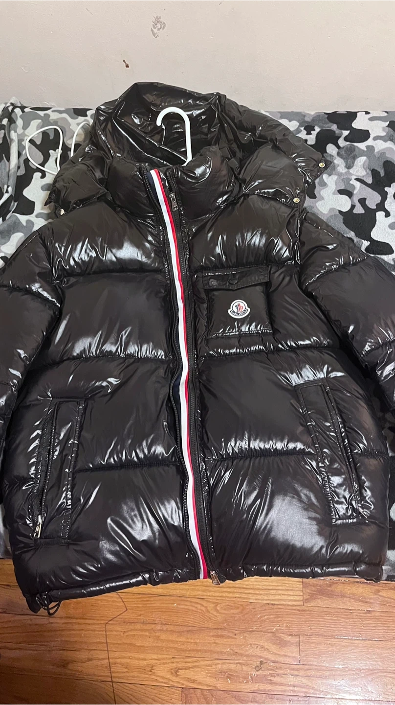 This is a black shiny puffer jacket from Moncler. It features a red, white, and blue stripe down the zipper. The jacket has a hood and two front pockets. It's made for warmth and style!